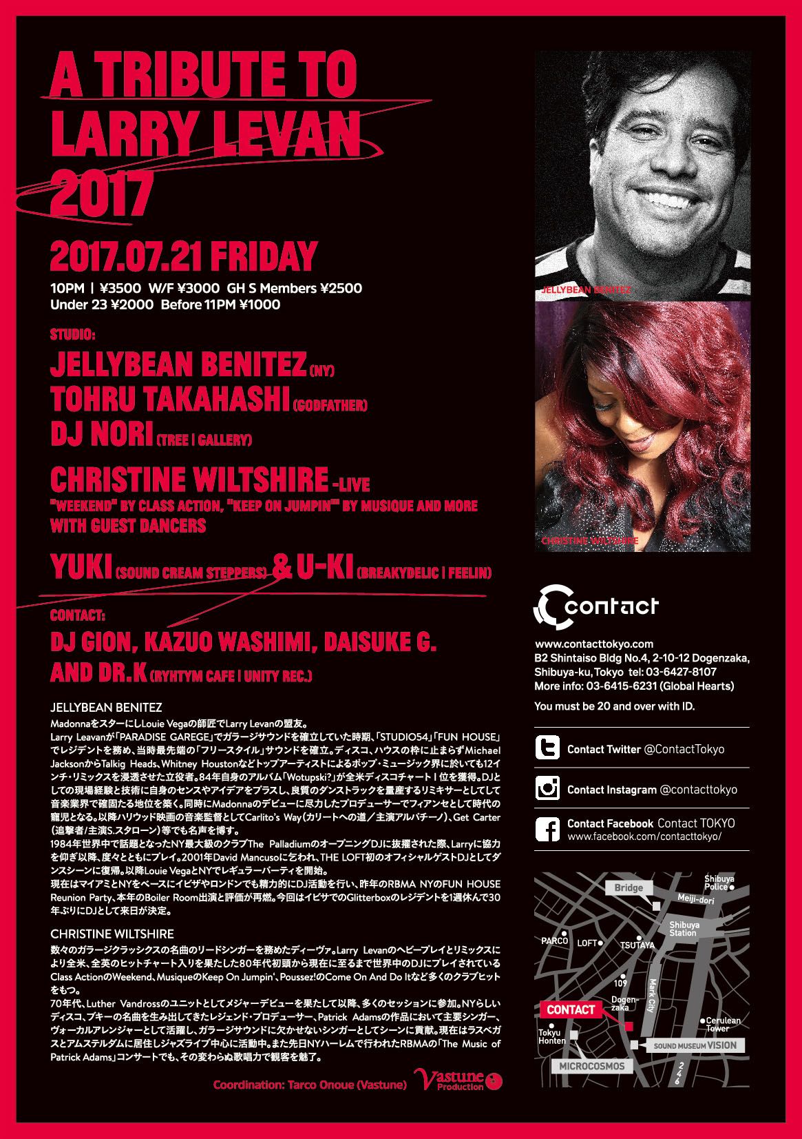 ディスコサウンドを定義づけ、黎明期のハウスミュージックに多大な影響を与えたLarry Levanがこの世を去って25年。伝説的パーティParadise GarageのレジデントDJとして活躍した彼の誕生日(1954年7月20日)を記念して、この日は縁のあるラインナップをフィーチャー! デビュー前からParadiseGarageに通い詰めていたマドンナなど数々の才能をスターダムに押し上げた敏腕プロデューサーのJellybeanBenitezと、大ヒットを記録したディスコチューン「Keep on Jumpin’」のボーカルを担当したChristine Wiltshireを迎える。日本からはTohru TakahashiとDJ Noriが参加。ハウスミュージックが爆発的な広がりを見せていた80年代にいち早く渡米し、Larry