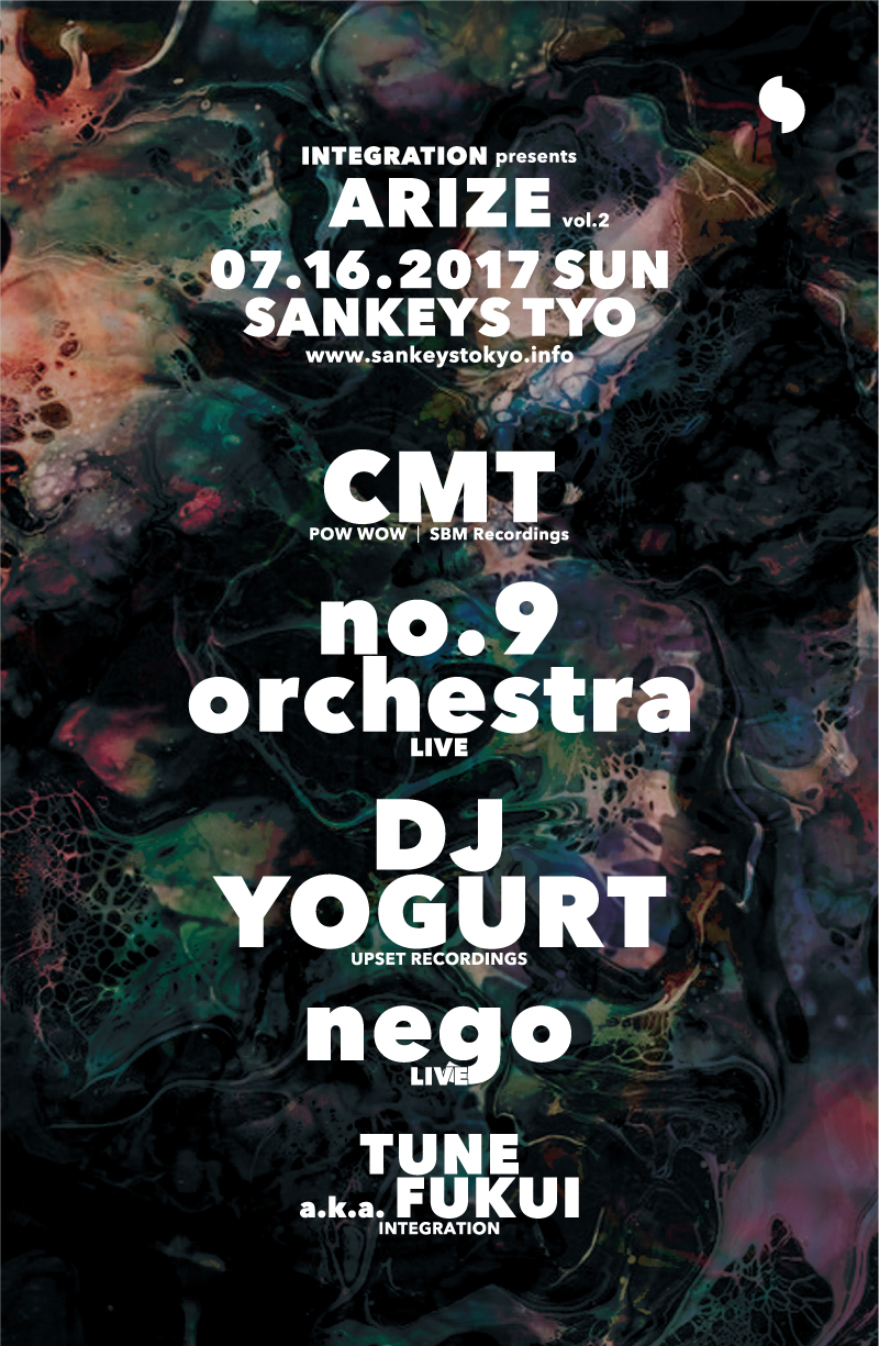 DJ、LIVE、アートや出店など各種コンテンツの融合をコンセプトに、独自の空間を築き上げるパーティ”INTEGRATION"が主宰する屋内フェス型パーティ”ARIZE"。2回目の開催となる今回は、レジデントのDJ Yogurt、LIVEユニットのnegoに加え、自身が主宰するDIYセルフレーベルSBM recordingsからリリースされたばかりの新作MIXCD『DESCONOCIDO』が好評を博しているCMTと、no.9こと城 隆之が結成するギターやドラム、バイオリン、ピアノなど生楽器中心の6人編成バンド、no.9 orchestraをフィーチュアする。空間を包みこむような圧倒的なプレイと存在感で、これまで多くのファンを魅了してきた彼らが創り出す一晩のストーリーを心ゆくまで楽しんで欲しい。