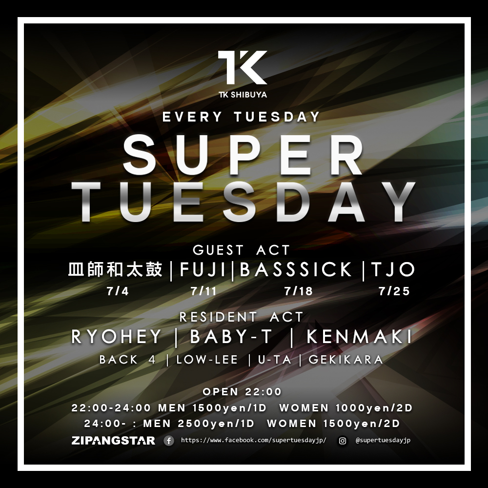 東京の遊びの中心「渋谷」の新たな遊び場「TK SHIBUYA」が、毎週火曜日に開催するパーティー「SUPER TUESDAY」!この「スパチュー」ではEDMは勿論、HIP HOPやベースMUSIC等、今、世界で主流の音楽がジャンルレスに体感できる!豪華なレギュラーDJ陣に加え毎週多彩なゲストDJを招き、他の平日では味わえない最高の夜をお楽しみ頂けます!