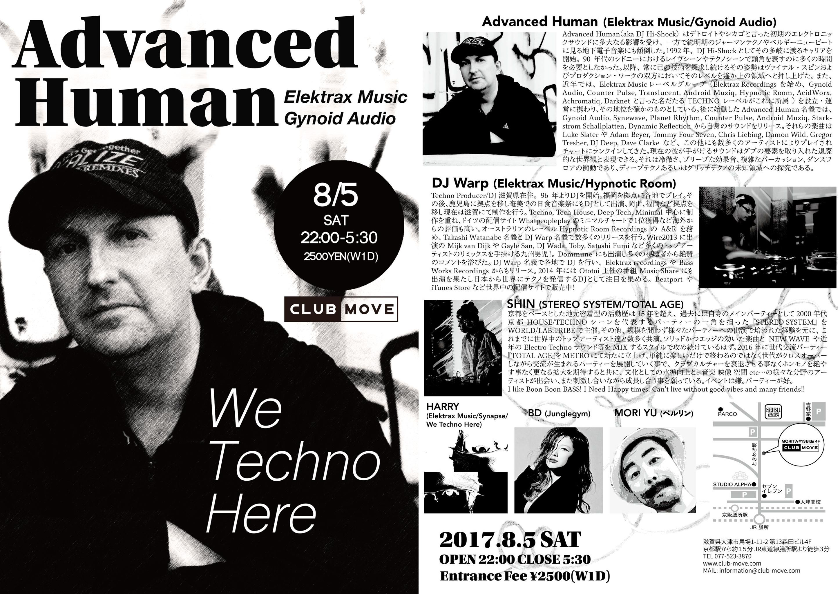 (ElektraxMusic,Gynoid Audio)Advanced Human (aka DJ Hi-Shock)はデトロイトやシカゴと言った初期のエレクトロニックサウンドに多大なる影響を受け、一方で総明期のジャーマンテクノやベルギーニュービートに見る地下電子音楽にも傾倒した。 1992年、DJ Hi-Shockとしてその多岐に渡るキャリアを開始。90年代のシドニーにおけるレイヴシーンやテクノシーンで頭角を表すのに多くの時間を必要としなかった。以降、常に己の技術を探求し続けるその姿勢はヴァイナル・スピンおよびプロダクション・ワークの双方においてそのレベルを遙か上の領域へと押し上げた。 また、近年では、Elektrax Music レーベルグループ (Elektrax Recordings を始め、Gynoid Audio, Counter Pulse,Translucent, Android Muziq, Hypnotic Room, AcidWorx, Achromatiq, Darknet と言った名だたるTECHNOレーベルがこれに所属) を設立・運営に携わり、その地位を確かのものとしている。 後に始動したAdvanced Human 名義では、Gynoid Audio、Synewave、Planet Rhythm、Counter Pulse、Android Muziq、Starkstrom Schallplatten、Dynamic Reflection から自身のサウンドをリリース。それらの楽曲は Luke Slater や Adam Beyer、Tommy Four Seven、Chris Liebing、Damon Wild、Gregor Tresher、DJ Deep、Dave Clarke など、この他にも数多くのアーティストによりプレイされチャートにランクインしてきた。現在の彼が手がけるサウンドはダブの要素を取り入れた退廃的な世界観と表現できる。それは冷徹さ、ブリープな効果音、複雑なパーカッション、ダンスフロアの衝動であり、ディープテクノあるいはグリッチテクノの未知領域への探究である。
