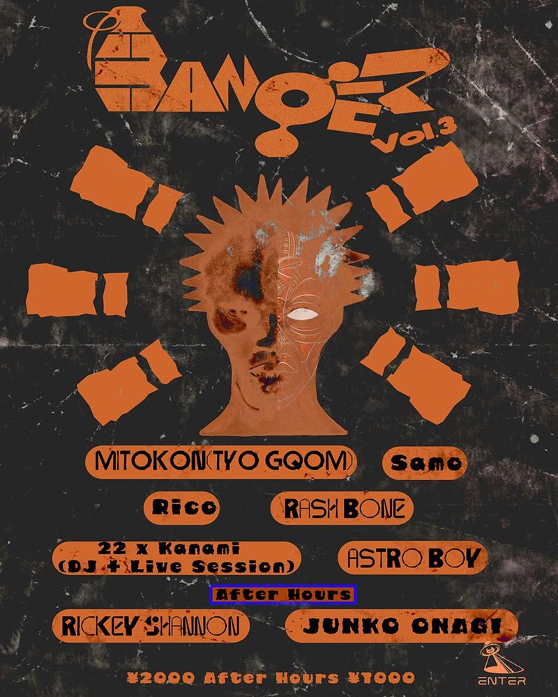 東京を拠点に活動する若手DJで構成されたDJクルーTERACOTTAのメンバーである22が主催する、ダンスホール、アフロビーツパーティBangerをENTER SHIBUYAで初開催。ナイトタイムにはアフロミュージックシーンの最重要人物mitokon、FULLHOUSEのSAMO、大阪よりRicoを招き、22と同じくTERACOTTAのメンバーであるAstro BoyとRash Boneがラインナップ。さらに関西を拠点に活動するサックスプレイヤーKanamiと22のライブ+DJセッションが組み込まれた。アフターアワーズにはスペインより帰国したRickey Shannonと、Junko Onagiが出演し、11時間のロングパーティを締め括り、1夜を通して満足間違いなしの豪華な出演陣が勢揃い。
