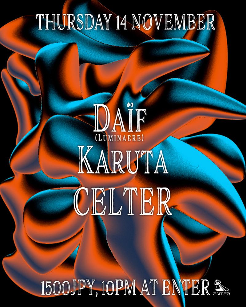 10月末よりアジアツアーを開始したDaïfがENTER初登場。今回が日本初上陸となるDaïfは幼少期からエレクトニックミュージックに興味を抱き、15歳の若さでDJを開始。その後Luminaereをオーガナイズし、同名のトラックをリリース。〈Tone Dropout〉、〈Art of Dark〉、〈OPIA〉などの著名レーベルからもリリースし、世界中の大型フェスティバルへの出演も果たしている実力派の彼と、Celter、KARUTAが共演。