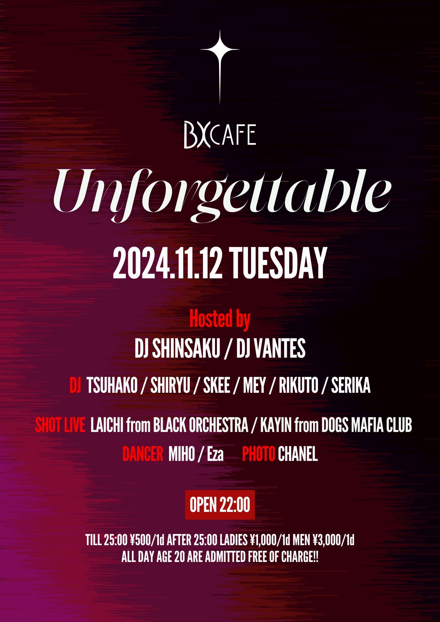 - LADIES ¥1,000/1d MEN ¥3,000/1d ※ TILL 25:00 ¥500/1d ※ AGE 20 ARE ADMITTED FREE OF CHARGE ALL DAY!!