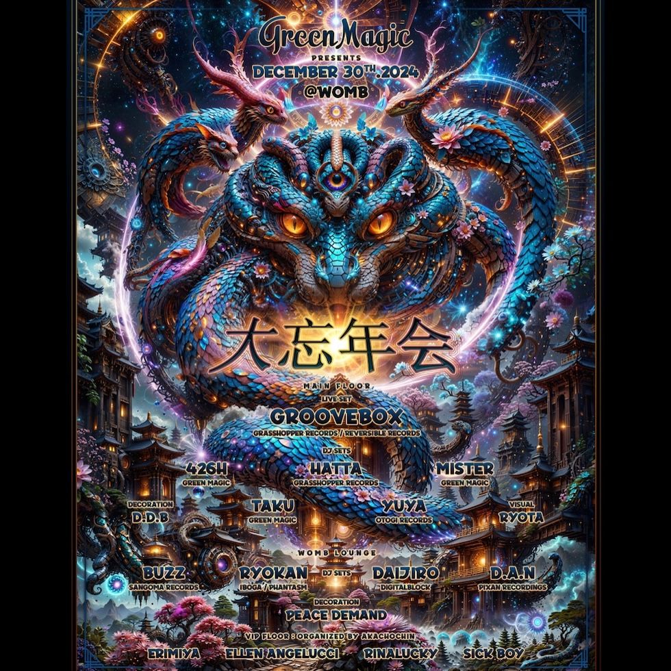 また来年へ向けて進みながら年内ラストパーティーとして、4年目となる Green Magic Presents 大忘年会を今年も WOMB にて開催。