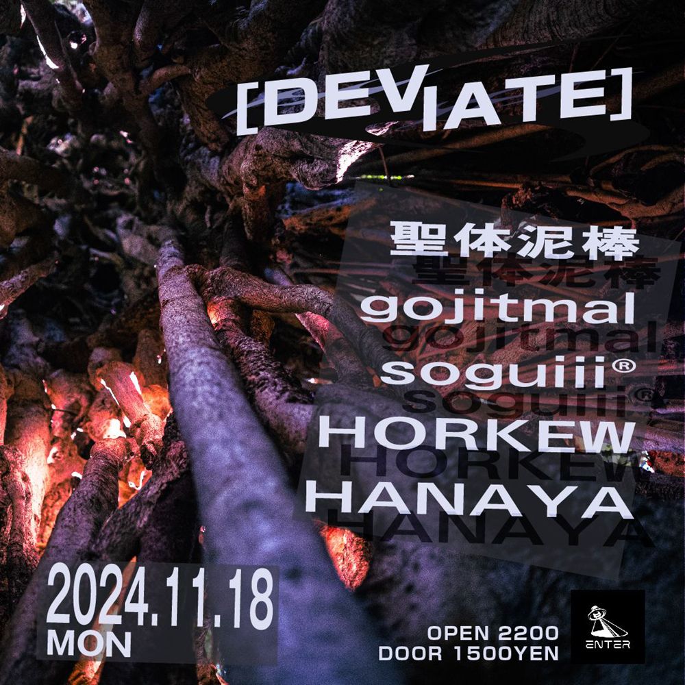 ロンドン滞在時にDJを始め、今年の春より関西から東京に拠点を移したsoguiii®︎、ANGELS主催のHORKEW、渋谷、下北沢、大宮を拠点に活動するテクノDJ HANAYAと、前回に引き続き愛知出身DJの聖体泥棒、渋谷を中心に活動し今年9月にスペイン・バルセロナのテクノレーベル〈APsychoMagicStory〉よりEP「CUERVOS」をリリースしたgojitmalが出演し、逸脱と歪曲が重なり合うダークテクノの世界へと導く