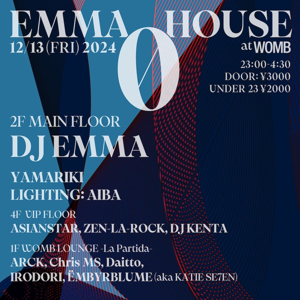 ダンスミュージックの歴史に名を轟かせる EMMA HOUSE。1994年芝浦 GOLD から JUNGLE BASS そして渋谷 MO、1998年から2008年の10年間、西麻布 Space Lab Yellow の看板パーティーとして毎月開催を続け、2016年から渋谷 SOUND MUSEUM VISION で開催してきた。ダンスミュージックの第一線を走り続けてきた EMMA HOUSE が、再び WOMB にて開催される。