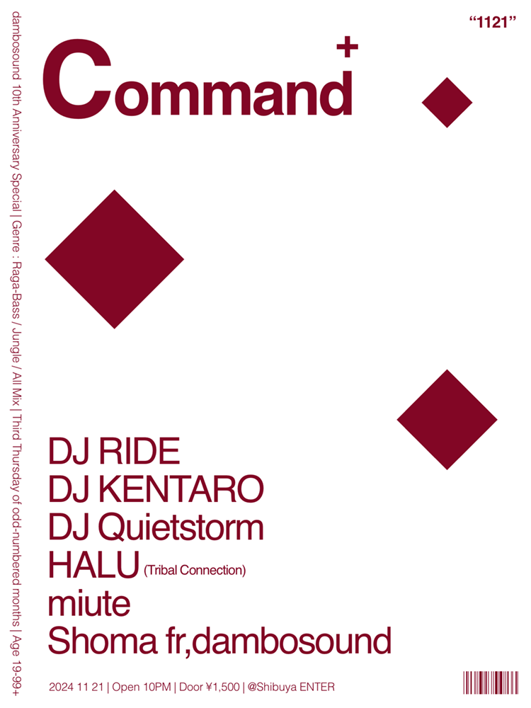 Shoma fr,dambosoundが主催するCommand + の第5回目。ポーランド発のDJコンテスト、IDA世界チャンピオンに2度輝き、〈VISION〉等、ヒップホップに多大な影響を与えてきた名門レーベルからのリリースを重ねるDJ、プロデューサーDJ RIDEをポルトガルより招聘。〈Ninja Tune〉よりシングル「Matsuri」をRIDEと共にリリースしたDJ KENTAROの7月のLIVING ROOM™以来の出演も決定。盟友RIDEと共に登場する。そして、LIVINGROOM™を10年以上開催し続け、数々の名場面を生み出してきた主導者DJ Quietstormもラインナップされ、DJ KENTAROと7月以来の共演。5名のジャングリストで構成されるジャングルクルーTribal ConnectionよりHalu、グライム、ヒップホップを軸に鮮やかに展開するプレイで活躍しているmiuteとフルボリュームのラインナップで10周年を祝う。