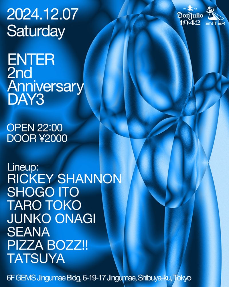 2022年12月15日にオープンしたENTER SHIBUYA。この度、2周年を祝した2週間に及ぶ9日間のアニバーサリーパーティを開催する。記念すべきDAY3は、テクノ、テックハウスを得意とする面々が揃った。兄弟ユニットShannon Brothersでは大型会場をテクノセットで揺らし、昨年よりスペインに渡りワールドツアーを敢行したRICKEY、今年3月に開催されたメロディックテクノ最重要パーティElementに出演したShogo Ito、サウンドデザインからマスタリングまでをトータルプロデュースしている実力派プロデューサーTaro Toko、バッグデザイナー、PR、キャスティング、インフルエンサーなど多様なフィールドでマルチに活躍しているJunko Onagi、ENTER初登場のSEANA、domino、Goz B、hiroの3人組ユニットPIZZA BOZZ!!、WARPにてオープン当時より開催されているハウスイベントescapeのレギュラーDJ TATSUYAが出演する。