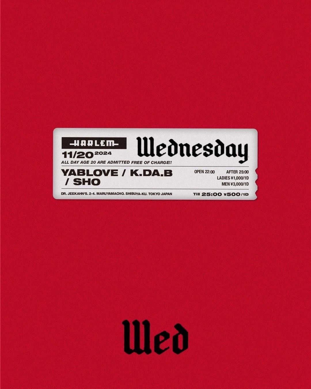 2024.11 20 NOV Wednesday HIPHOP ALLMIX 0 Shares Facebook Twitter google Line DATE: 2024-11-20 WED OPEN: 22:00 VENUE: PRICE: LADIES ¥1,000/1d MEN ¥3,000/1d ※ TILL 25:00 ¥500/1d ※ AGE 20 ARE ADMITTED FREE OF CHARGE ALL DAY!! LINE UP: DJ: YABLOVE, K.DA.B, SHO DJ: YABLOVE, K.DA.B, SHO