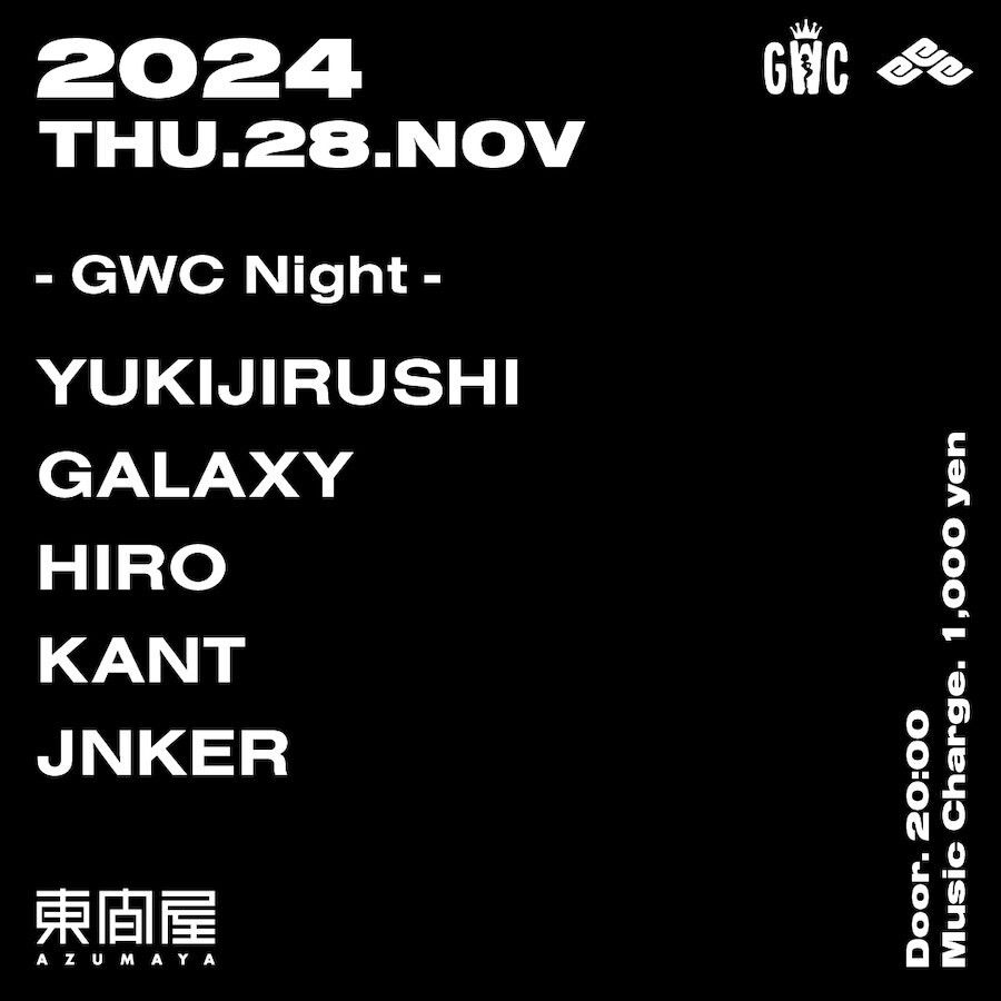 2024.11 28 NOV GWC Night HIPHOP 0 Shares Facebook Twitter google Line DATE: 2024-11-28 THU OPEN: 20:00 VENUE: PRICE: Music Charge 1,000yen LINE UP: YUKIJIRUSHI GALAXY HIRO KANT JNKER