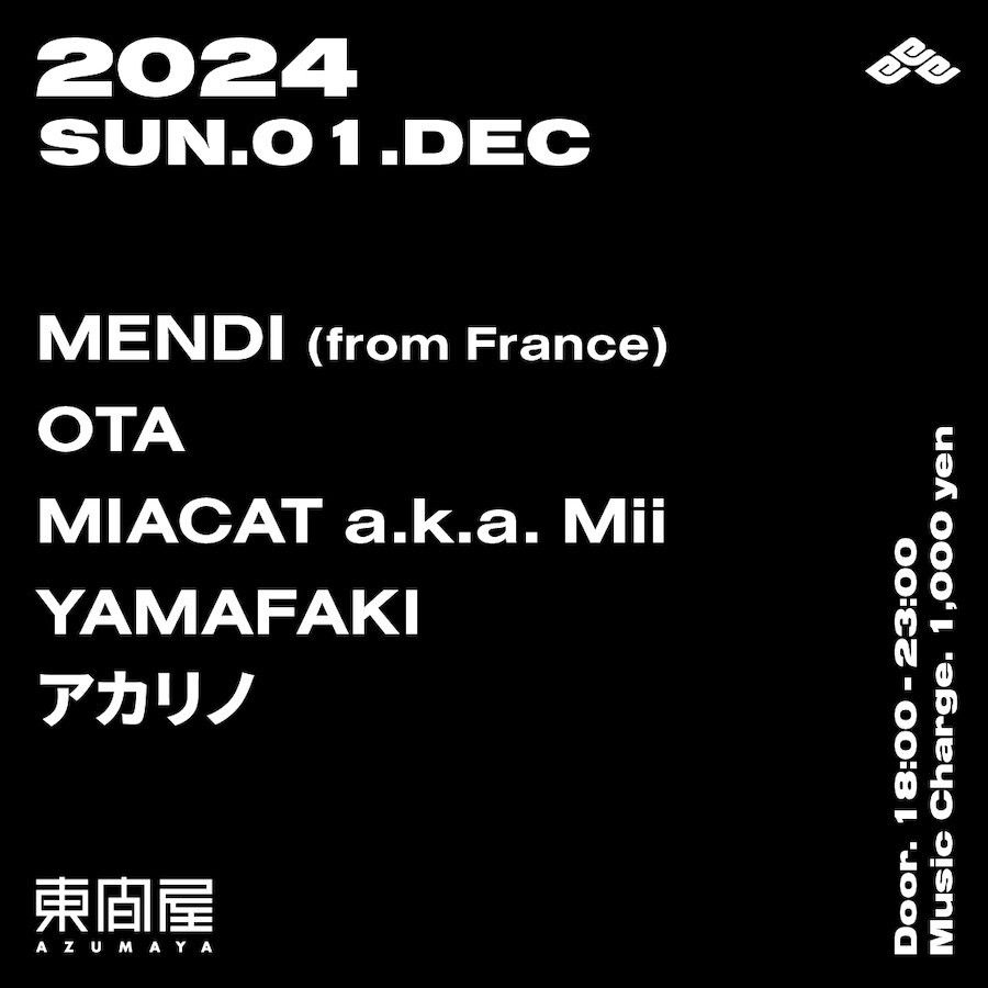 2024.12 01 DEC Azumaya -Sunday- BREAKBEATS OTHER 0 Shares Facebook Twitter google Line DATE: 2024-12-01 SUN OPEN: 18:00 VENUE: PRICE: Music Charge 1,000yen LINE UP: MENDI (from France) OTA MIACAT a.k.a. Mii YAMAFAKI アカリノ