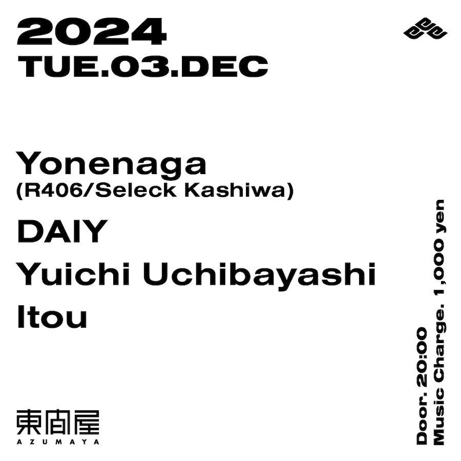 2024.12 03 DEC Azumaya -Friday- TECHNO HOUSE 0 Shares Facebook Twitter google Line DATE: 2024-12-03 TUE OPEN: 20:00 VENUE: PRICE: Music Charge 1,000yen LINE UP: Yonenaga (R406/Seleck Kashiwa) DAIY Yuichi Uchibayashi Itou