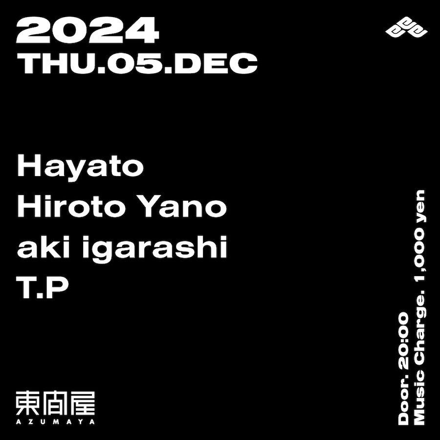 2024.12 05 DEC Azumaya -Thursday- HOUSE 0 Shares Facebook Twitter google Line DATE: 2024-12-05 THU OPEN: 20:00 VENUE: PRICE: Music Charge 1,000yen LINE UP: Hayato Hiroto Yano aki igarashi T.P