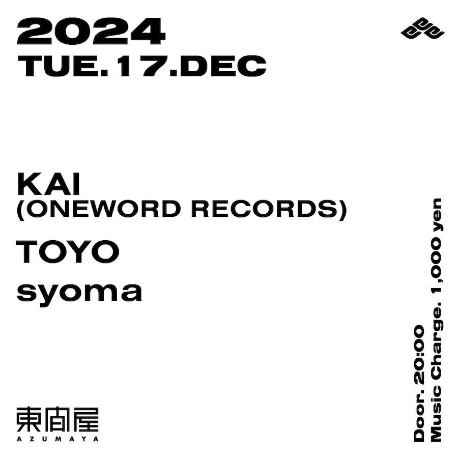 2024.12 17 DEC Azumaya -Tuesday- HOUSE 0 Shares Facebook Twitter google Line DATE: 2024-12-17 TUE OPEN: 20:00 VENUE: PRICE: Music Charge 1,000yen LINE UP: KAI (ONEWORD RECORDS) TOYO syoma