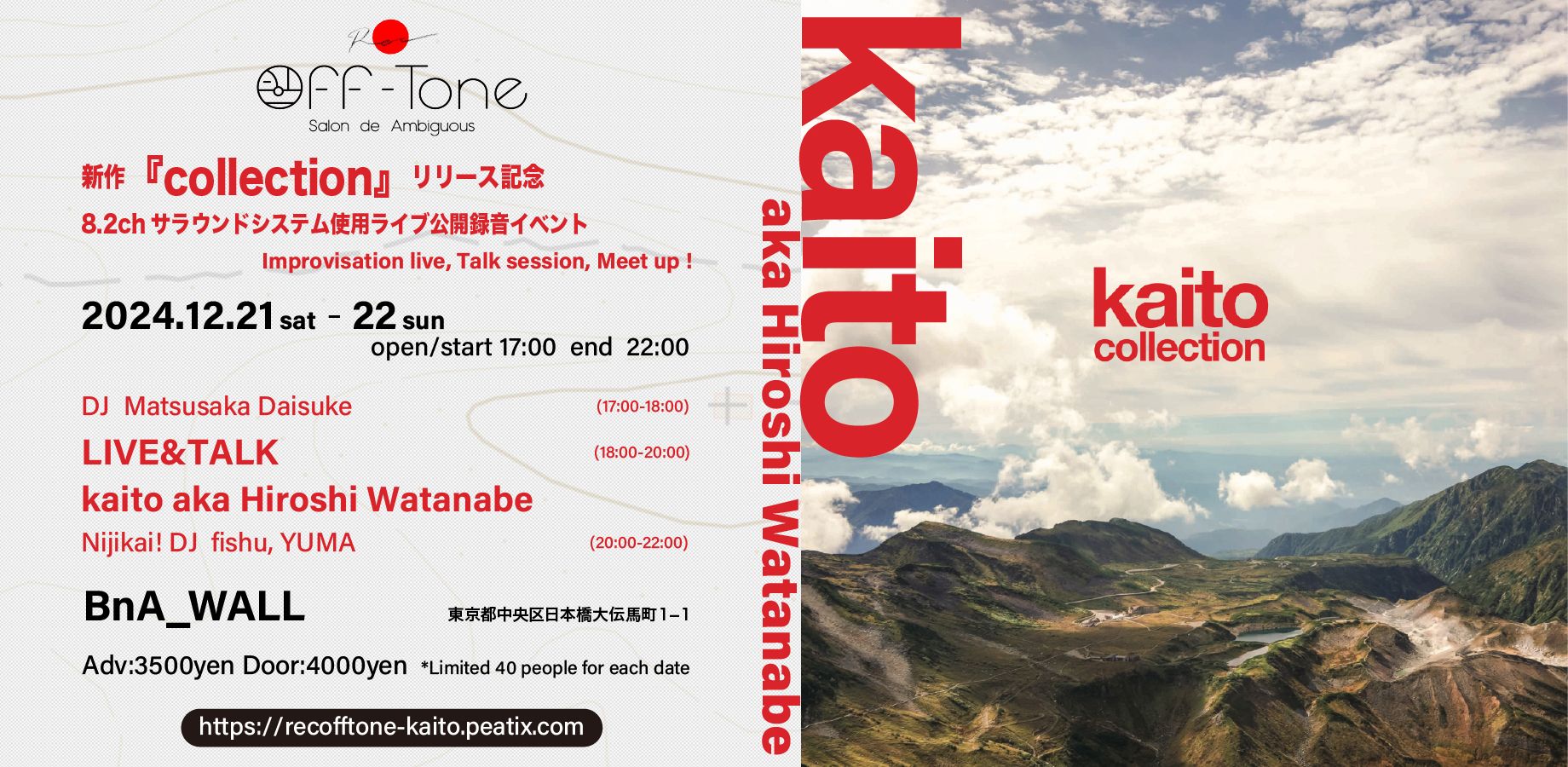 「Off-Tone(オフトーン」が、日本橋のアートホテル「BnA_WALL」で、Kaito aka Hiroshi Watanabeの新作『Collection』リリースを記念し、CAMP Off-Tone 2023で大好評だった8.2chサラウンドシステムを導入した公開録音ライブイベントを開催します。ライブのほか、トークショー、出演者との交流会もあります。