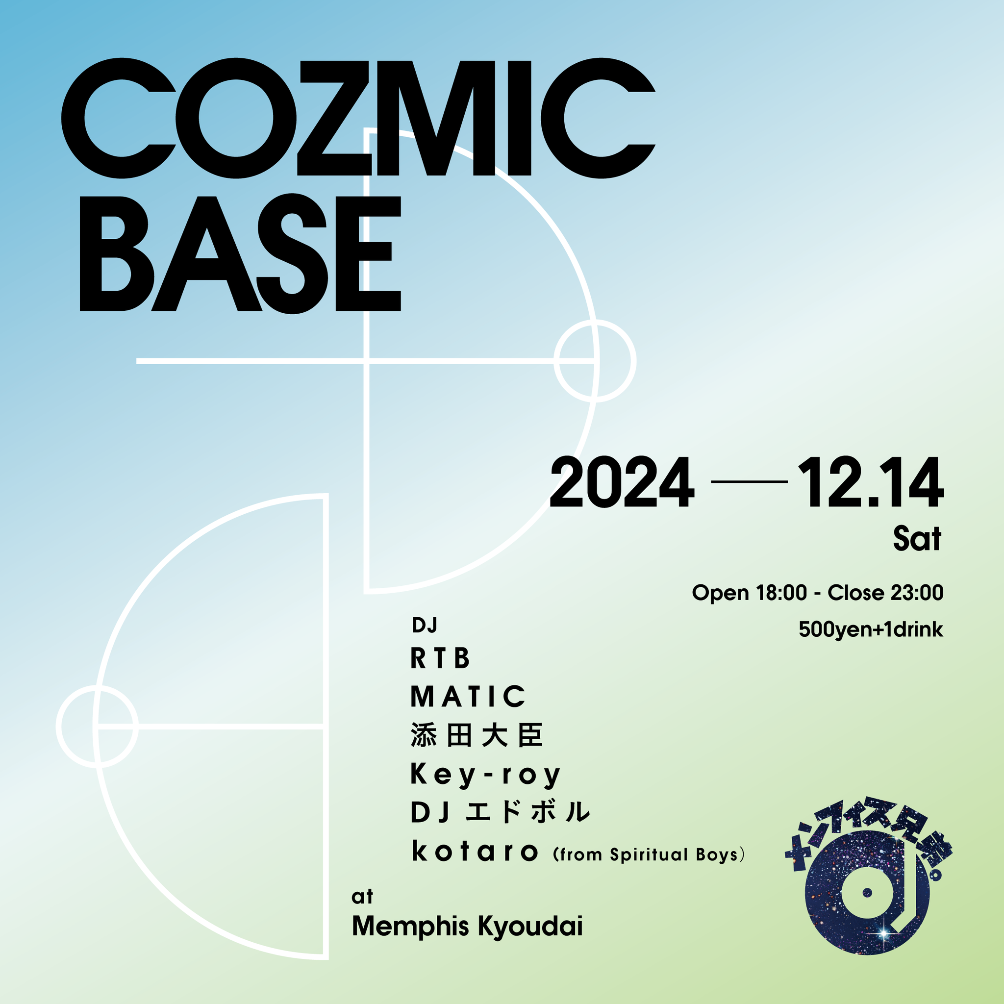 2024.12 14 DEC COZMIC BASE ALLMIX HIPHOP R&B J-POP HOUSE 0 Shares Facebook Twitter google Line DATE: 2024-12-14 SAT OPEN: 18:00 VENUE: PRICE: Entrance:500yen + 1drink LINE UP: RTB, MATIC, 添田大臣, Key-roy, DJエドボル, kotaro 宇宙、日本、下北沢。 2ヶ月に一度の土曜日の午後、終わりと始まりの消失、地下スペースで宇宙遊泳的に音楽をゆるりと楽しむアットホームなイベント(お菓子付)。