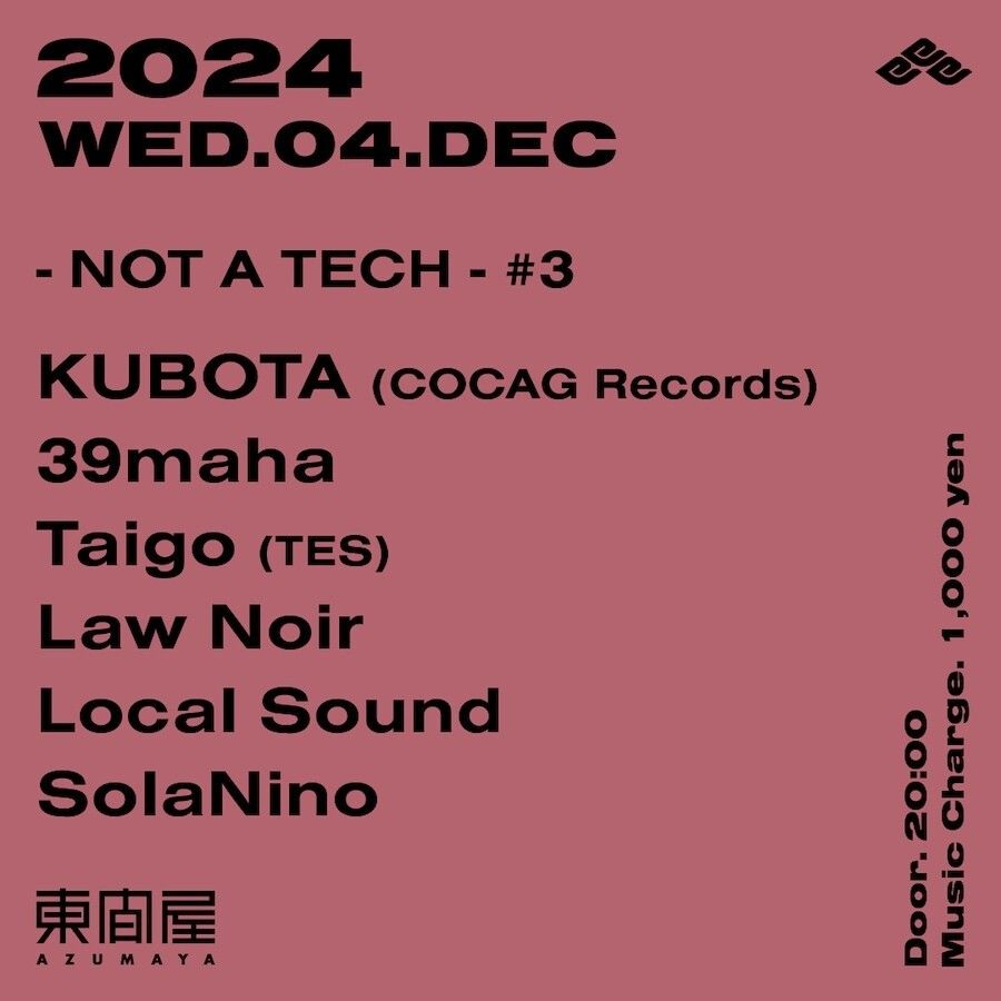 2024.12 04 DEC - NOT A TECH - #3 TECHNO HOUSE 0 Shares Facebook Twitter google Line DATE: 2024-12-04 WED OPEN: 20:00 VENUE: PRICE: Music Charge 1,000yen LINE UP: KUBOTA (COCAG Records) 39maha Taigo (TES) Law Noir Local Sound SolaNino