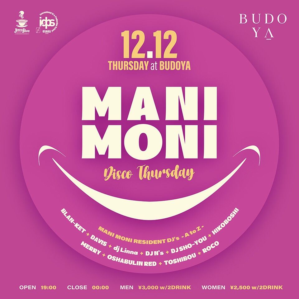 Since 12 December 2024, MANI MONI has been held every Thursday night from 7pm to midnight at Budoya in Umeda, Osaka, as a regular party, supported by the coffee shop Java Jive WEST.
