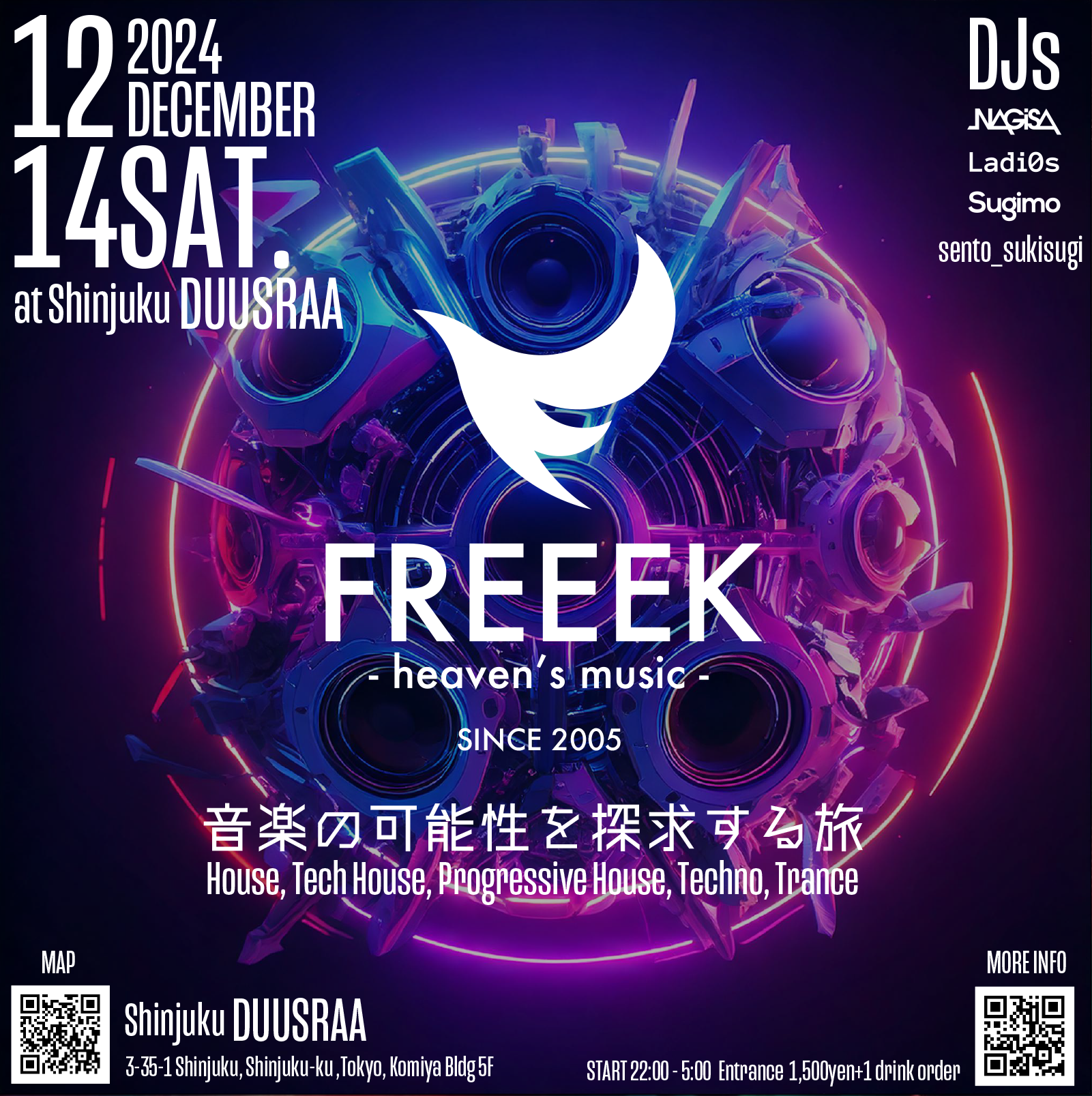 2024.12 14 DEC FREEEK HOUSE TECH HOUSE TRANCE EDM TECHNO 0 Shares Facebook Twitter google Line DATE: 2024-12-14 SAT OPEN: 22:00 VENUE: PRICE: 1500 yen (+1 drink order) LINE UP: NAGiSA,Ladi0s,Sugimo,sento_sukisugi FREEEK - heaven's music は、新譜を中心としたハウスミュージックを軸に、ダークで深いサウンドから美しいメロディアスな楽曲まで、幅広い選曲で一晩中楽しめるパーティーです。 DUUSRAAの高品質なサウンドシステムが音楽のディテールを鮮明に再現し、体が自然と動き出すような没入感を提供します。音楽の自由とエッジの効いたサウンドを求めるすべての人に贈る特別な時間です。 フロアで感じる高揚感、一体感、そして音楽がもたらす解放感。 音楽を通じて、心と体が自由になる瞬間を共有しましょう。 We are all ONE!! 新宿DUUSRAAで、音楽の力を体験してください。
