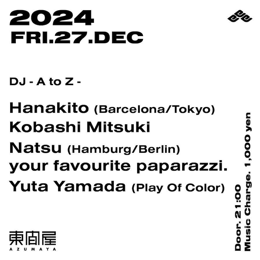 2024.12 27 DEC Azumaya -Tuesday- HOUSE 0 Shares Facebook Twitter google Line DATE: 2024-12-27 FRI OPEN: 21:00 VENUE: PRICE: Music Charge 1,000yen LINE UP: Hanakito (Barcelona/Tokyo) Kobashi Mitsuki Natsu (Hamburg/Berlin) your favourite paparazzi. Yuta Yamada (Play Of Color)