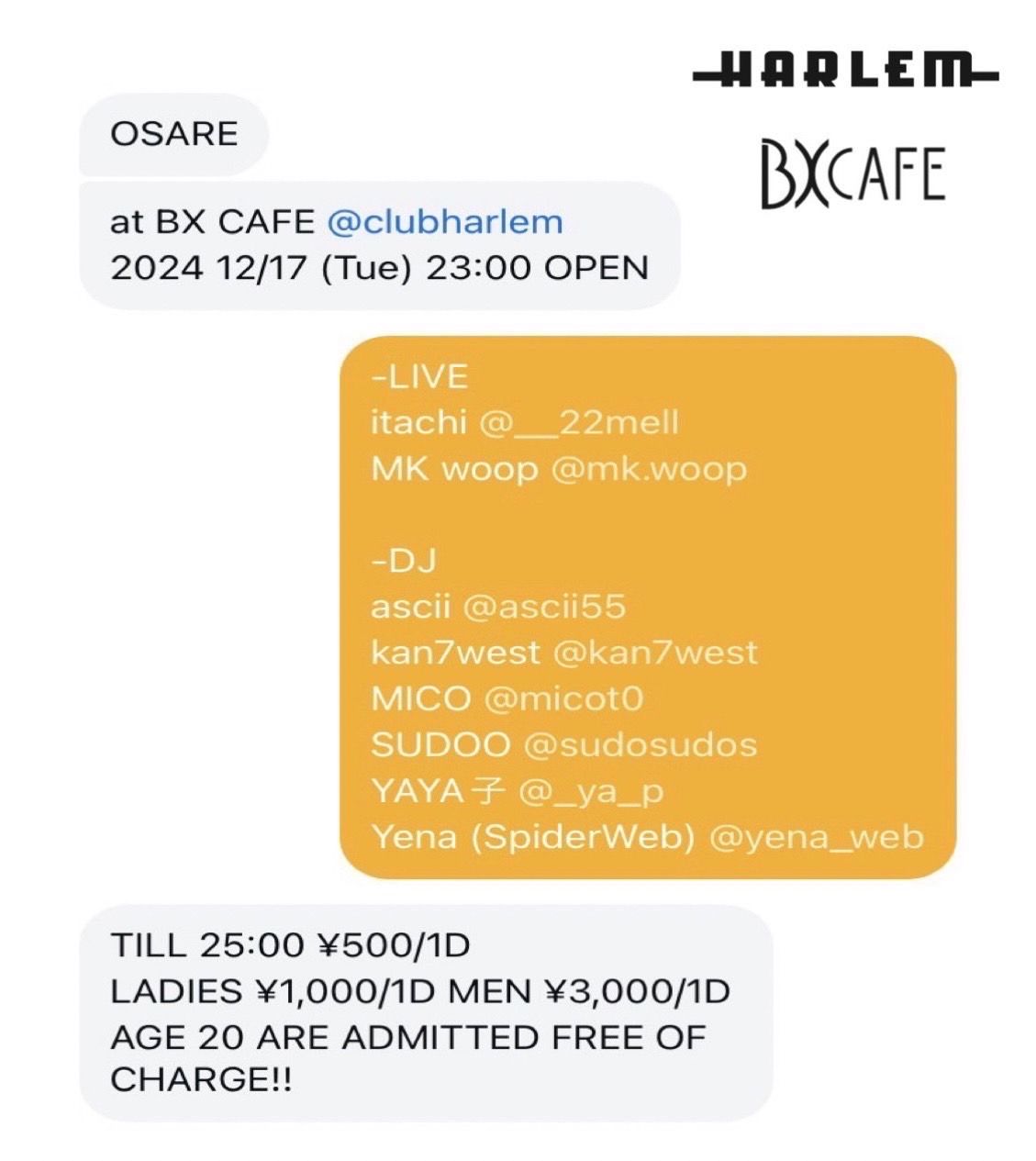 - LADIES ¥1,000/1d MEN ¥3,000/1d ※ TILL 25:00 ¥500/1d ※ AGE 20 ARE ADMITTED FREE OF CHARGE ALL DAY!!