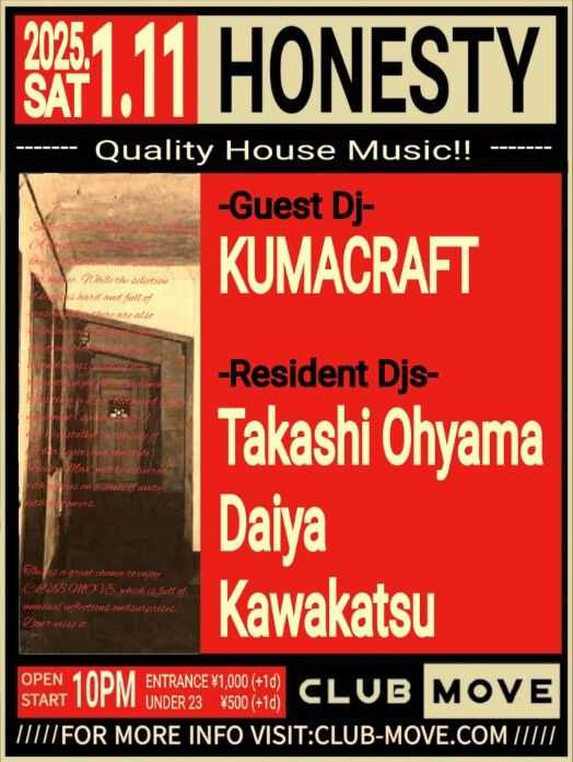 新年一発目となる今回は神戸よりKUMACRAFT氏を招聘。ハウス好きにはたまらないディープな流れでの空間演出は必聴です。是非、お見逃しなく!!