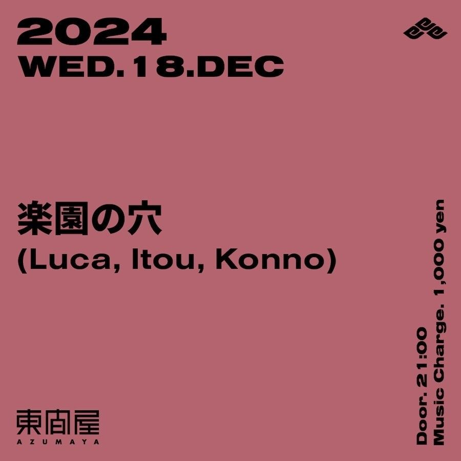 2024.12 18 DEC Azumaya -Wednesday- OTHER 0 Shares Facebook Twitter google Line DATE: 2024-12-18 WED OPEN: 20:00 VENUE: PRICE: Music Charge 1,000yen LINE UP: 楽園の穴 (Luca, Itou, Konno)