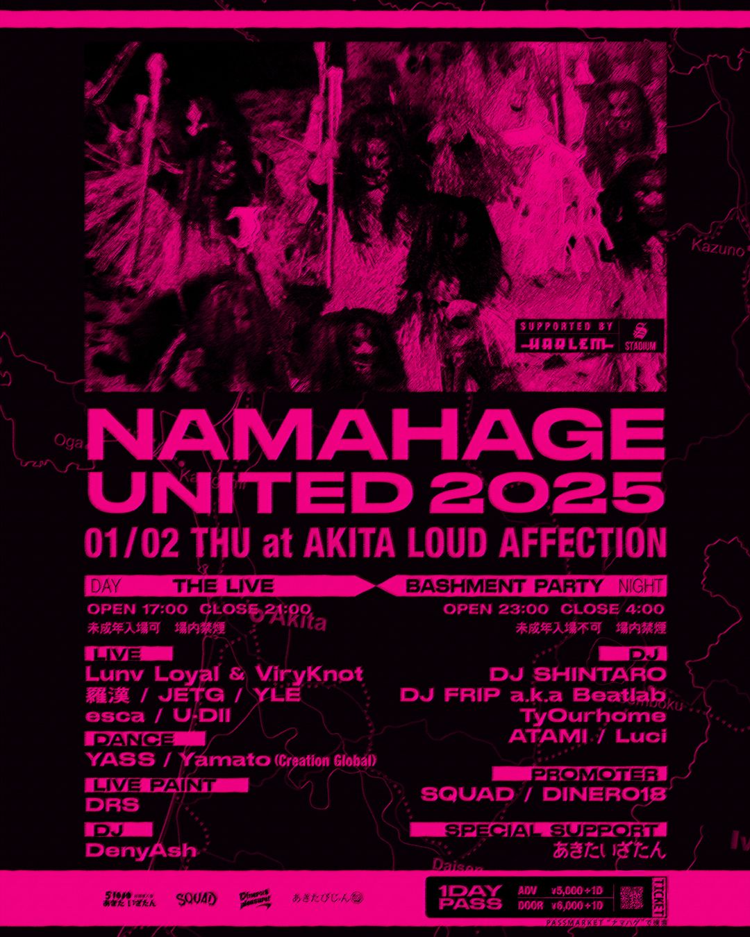 「NAMAHAGE UNITED 2025 Supported by HARLEM & STADIUM」は秋田市・LOUD AFFECTIONにて2025年1月2日に、デイタイムにライブ中心の『THE LIVE』、ナイトタイムにクラブスタイルのDJパーティー『BASHMENT PARTY』の二部構成での開催。