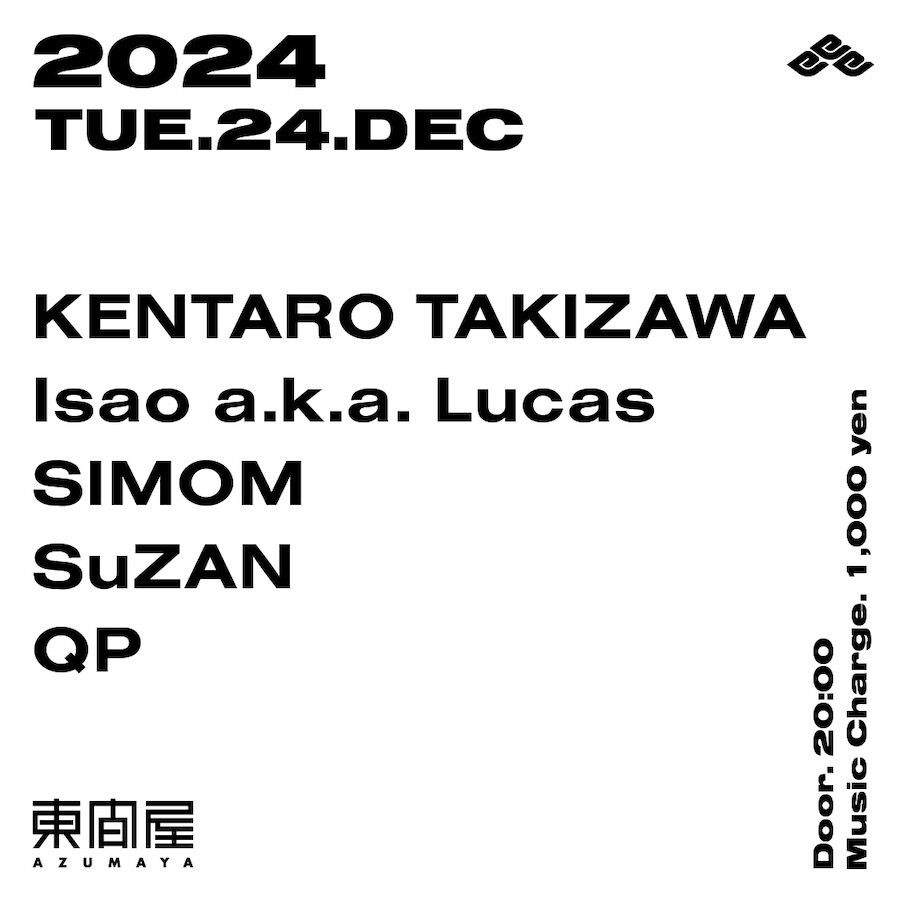 2024.12 24 DEC Azumaya -Tuesday- ALLMIX 0 Shares Facebook Twitter google Line DATE: 2024-12-24 TUE OPEN: 20:00 VENUE: PRICE: Music Charge 1,000yen LINE UP: KENTARO TAKIZAWA Isao a.k.a. Lucas SIMOM SuZAN QP