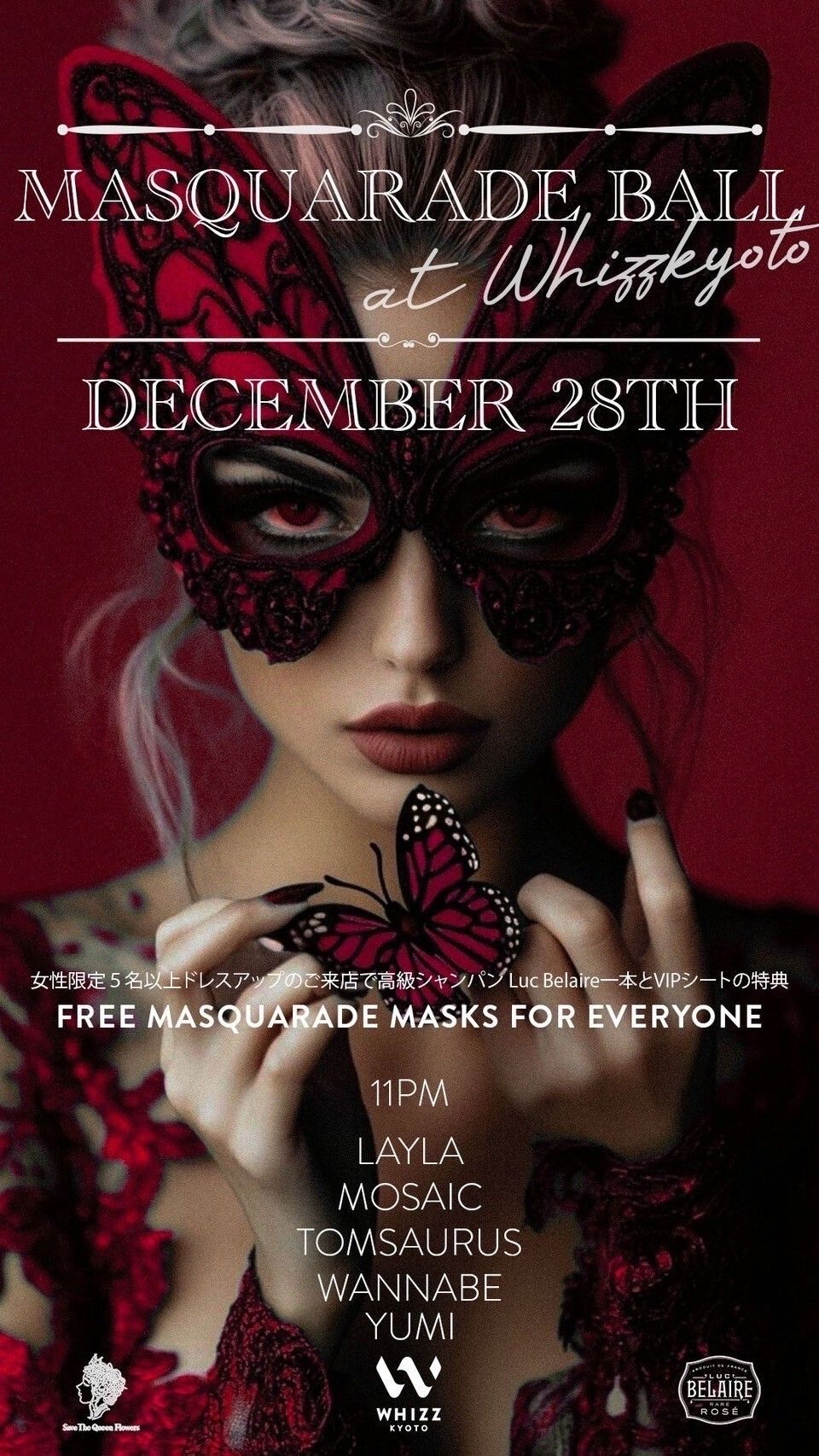 - FREE MASQUERADE MASKS FOR EVERYONE / 女性限定5名様以上ドレスアップのご来店で高級シャンパンLuc Belaire1本とVIPシートの特典