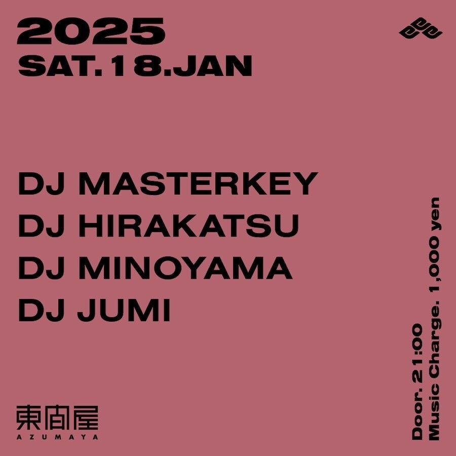 2025.01 18 JAN Azumaya -Saturday- HIPHOP 0 Shares Facebook Twitter google Line DATE: 2025-01-18 SAT OPEN: 21:00 VENUE: PRICE: Music Charge 1,000yen LINE UP: DJ MASTERKEY DJ HIRAKATSU DJ MINOYAMA DJ JUMI