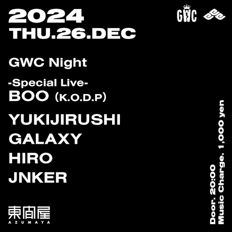 2024.12 26 DEC GWC Night HIPHOP 0 Shares Facebook Twitter google Line DATE: 2024-12-26 THU OPEN: 20:00 VENUE: PRICE: Music Charge 1,000yen LINE UP: -Special Live- BOO (K.O.D.P) YUKIJIRUSHI GALAXY HIRO JNKER