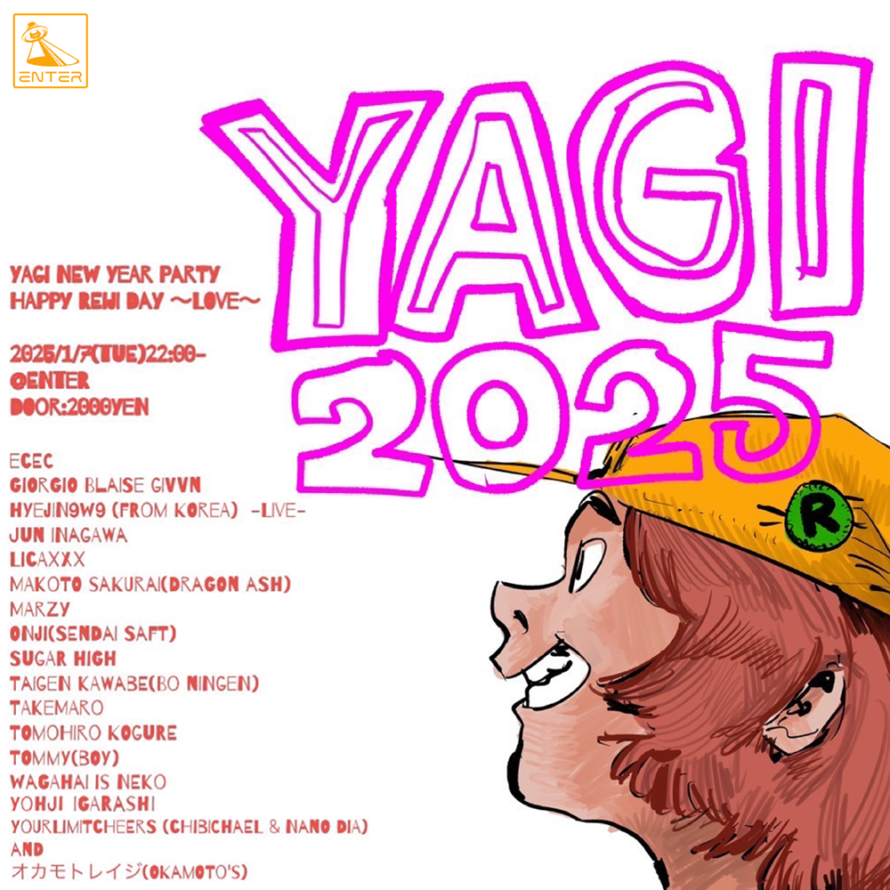 ENTER2025年1発目のパーティは、オカモトレイジ(OKAMOTO'S)キュレーション YAGI EXHIBITION によるNEW YEAR PARTYとオカモトレイジBIRTHDAY PARTYでの開催となる。