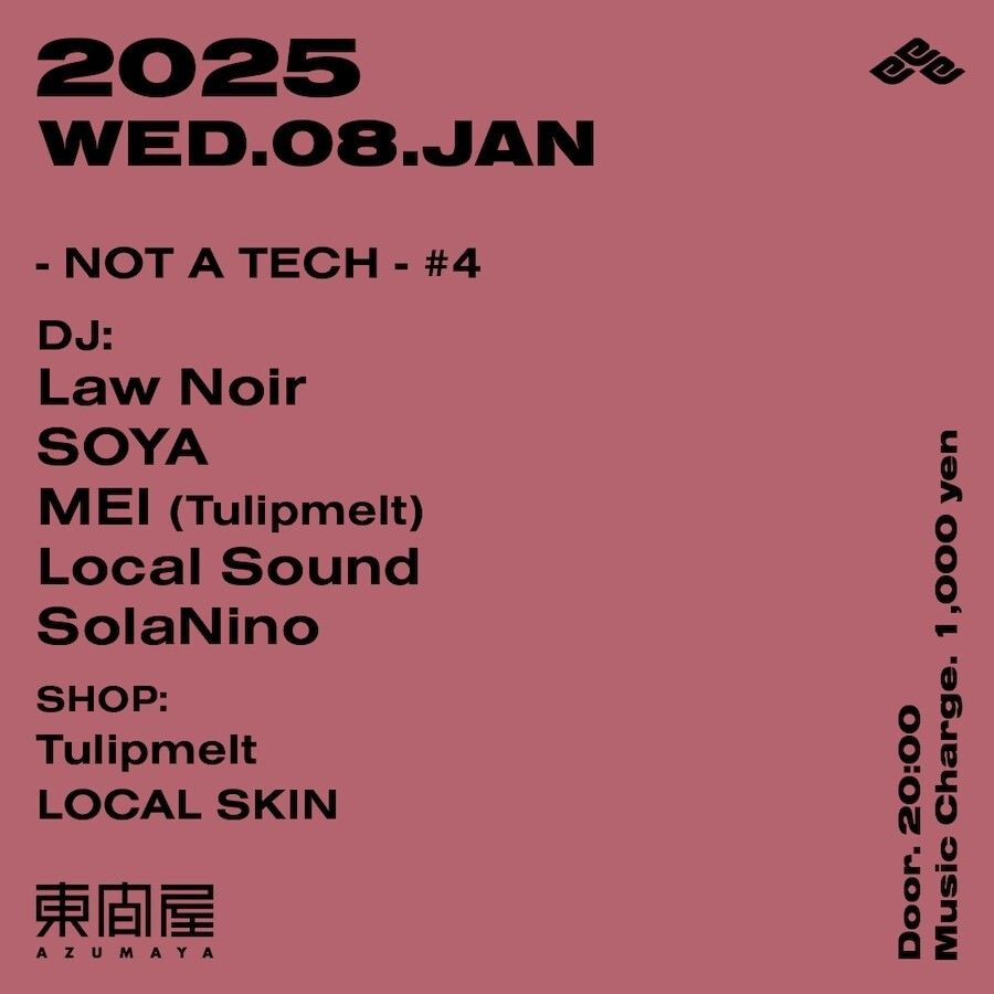 2025.01 08 JAN NOT A TECH #4 TECHNO HOUSE 0 Shares Facebook Twitter google Line DATE: 2025-01-08 WED OPEN: 20:00 VENUE: PRICE: Music Charge 1,000yen LINE UP: DJ: Law Noir SOYA MEI (Tulipmelt) Local Sound SolaNino SHOP: Tulipmelt LOCAL SKIN