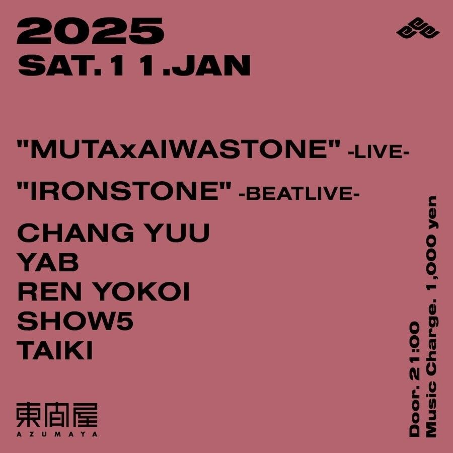 2025.01 11 JAN Azumaya -Saturday- ALLMIX 0 Shares Facebook Twitter google Line DATE: 2025-01-11 SAT OPEN: 21:00 VENUE: PRICE: Music Charge 1,000yen LINE UP: "MUTA×AIWASTONE" -LIVE- "IRONSTONE" -BEATLIVE- CHANG YUU YAB REN YOKOI SHOW5 TAIKI