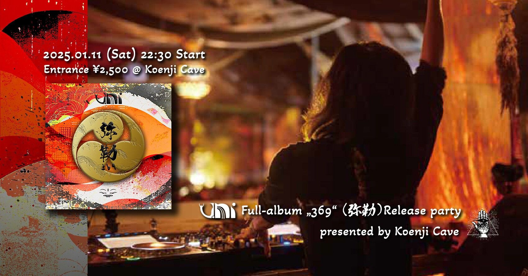 UNI - Album ‘369’ Release Party - presented by Koenji Cave Held on 11 Jan (Sat), 2025! UNI released the long-awaited full album ‘369 ’ (Maitreya) for fans in 2024, supported by Cave's fresh new DJs and Tomas from HARMONIOUS andMosaic Rec's HANABI. Please enjoy this event together with the TECHNO lounge by experienced DJs!!!