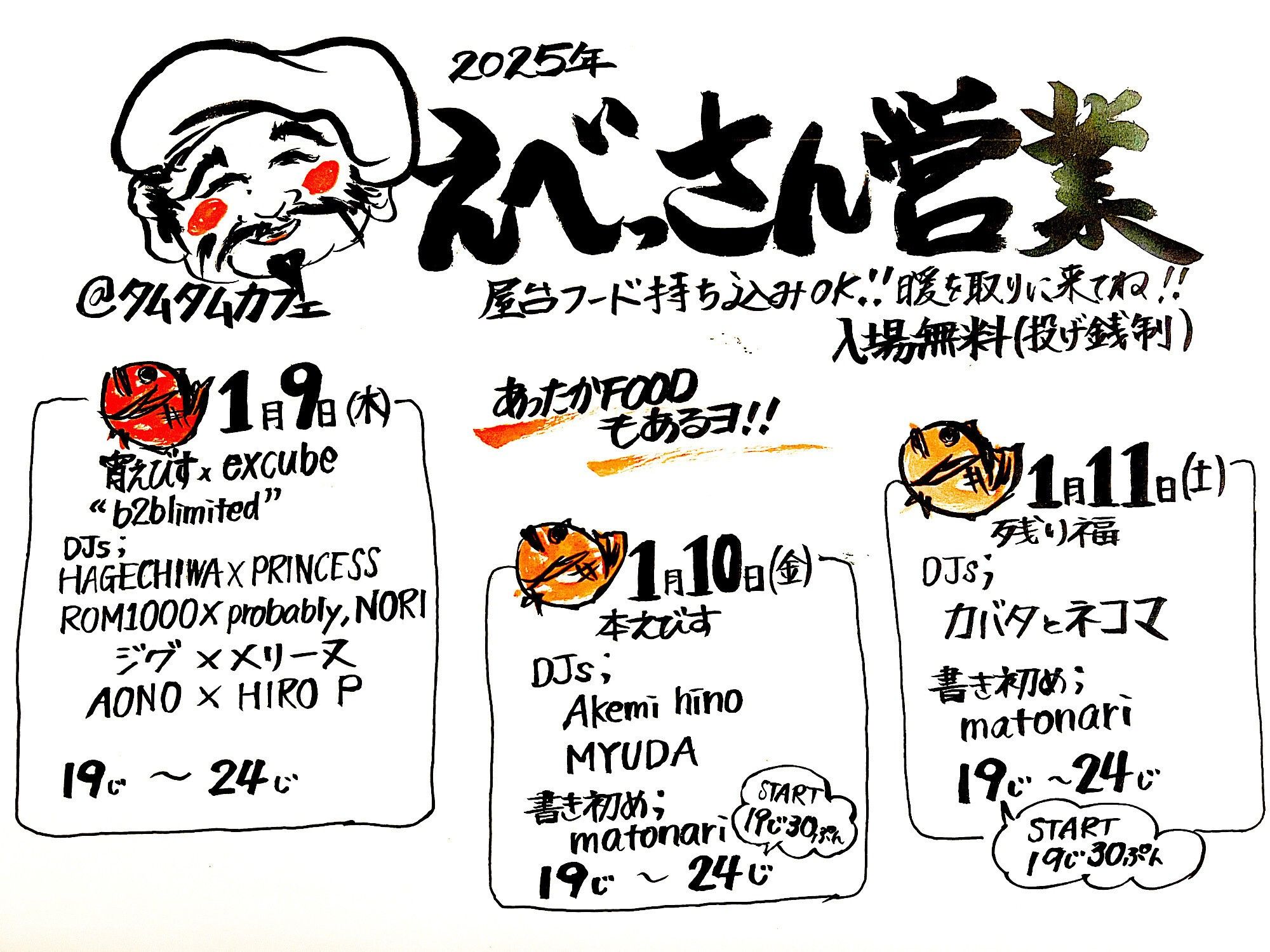 1月9日木曜〜11土曜は19時〜24時フードラストオーダー、今宮戎神社の十日戎に伴い『えべっさん営業2025』。9日木曜宵戎は人気のギャラリーexcubeにオーガナイズをお願いしてレアなb2b セットを企画してくれました。10日金曜本戎と11日土曜残り福はタムタムチョイスのグッドDJ陣を迎えての2日間で毎年恒例のmatonari(VOYAGE KIDS)による書き初めも◎3日間タムタムカフェはあったかメニューをご用意&店内もホカホカでおまちしており〼人混みと寒さに疲れたら休憩場所にどうぞ。屋台のフード持ち込みOK!