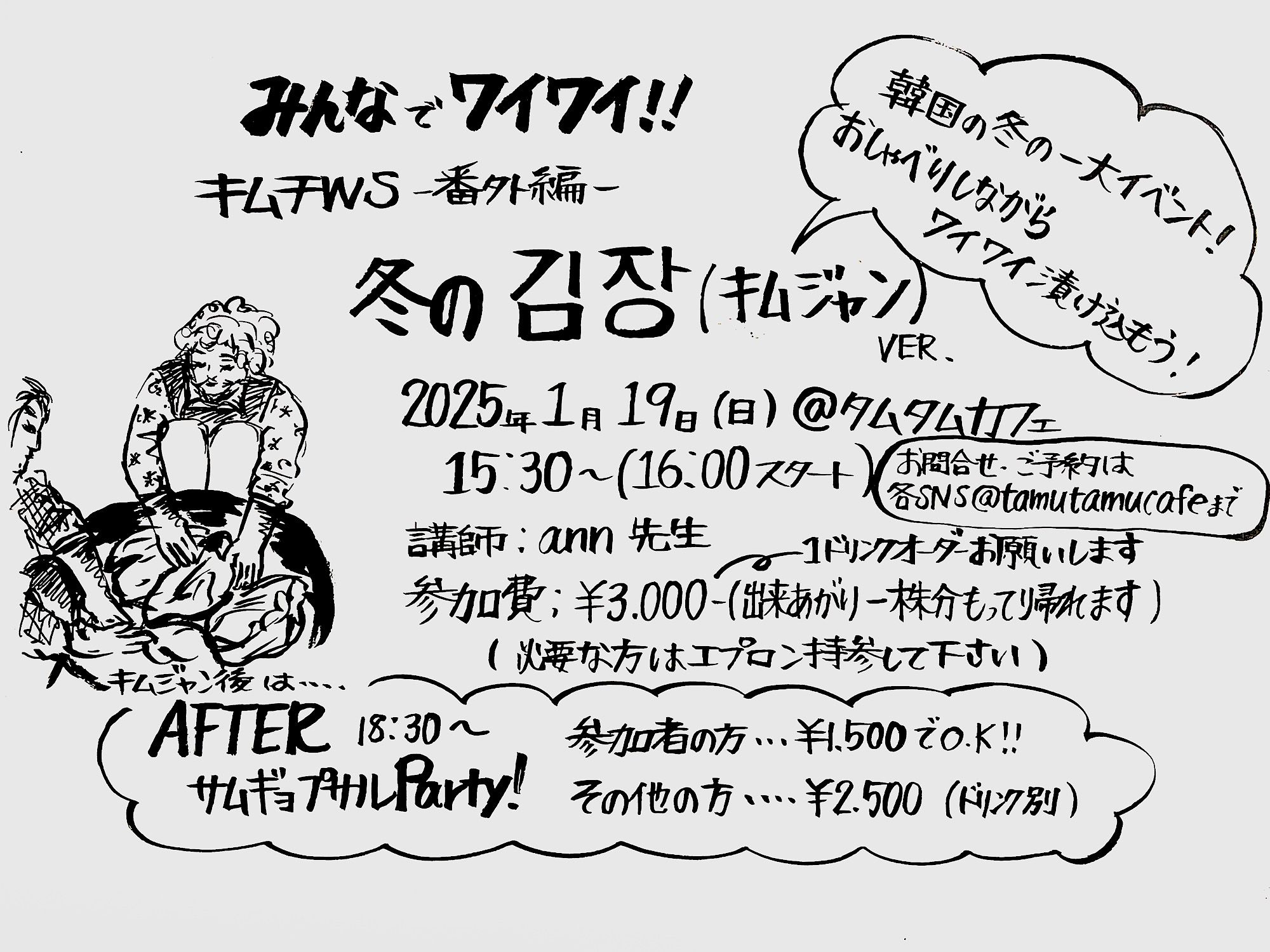 キムチws参加の方-¥1500でok! その他の方-¥2500(別途1drinkオーダー)