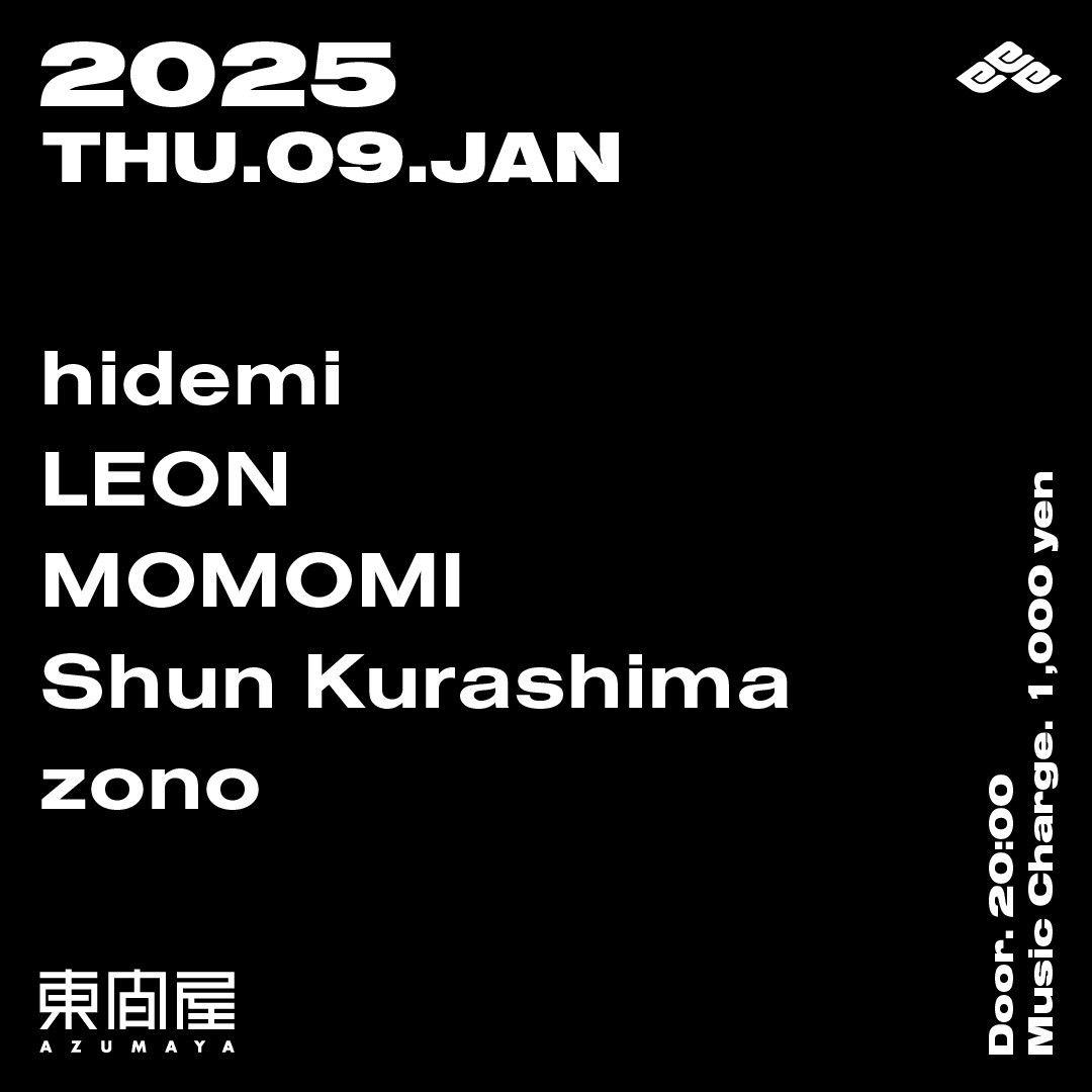 2025.01 09 JAN Azumaya -Thursday- HOUSE 0 Shares Facebook Twitter google Line DATE: 2025-01-09 THU OPEN: 20:00 VENUE: PRICE: Music Charge 1,000yen LINE UP: hidemi LEON MOMOMI Shun Kurashima zono
