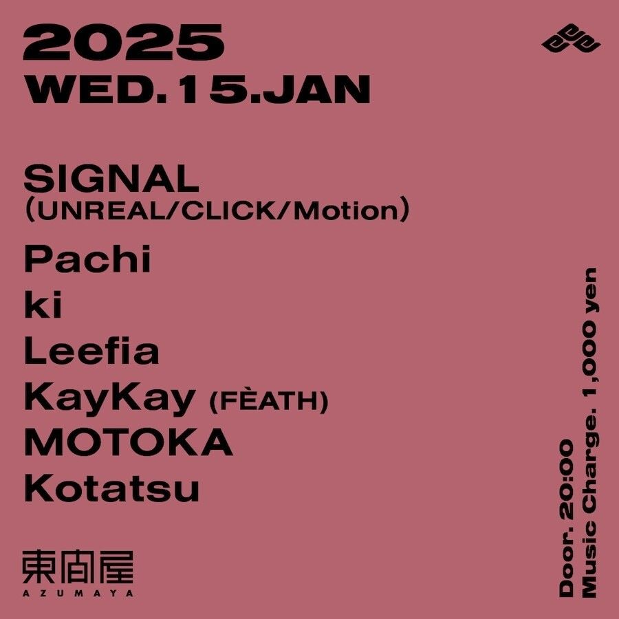 2025.01 15 JAN Azumaya -Wednesday- HOUSE TECHNO 0 Shares Facebook Twitter google Line DATE: 2025-01-15 WED OPEN: 20:00 VENUE: PRICE: Music Charge 1,000yen LINE UP: SIGNAL (UNREAL/CLICK/Motion) Pachi ki Leefia KayKay (FÈATH) MOTOKA Kotatsu