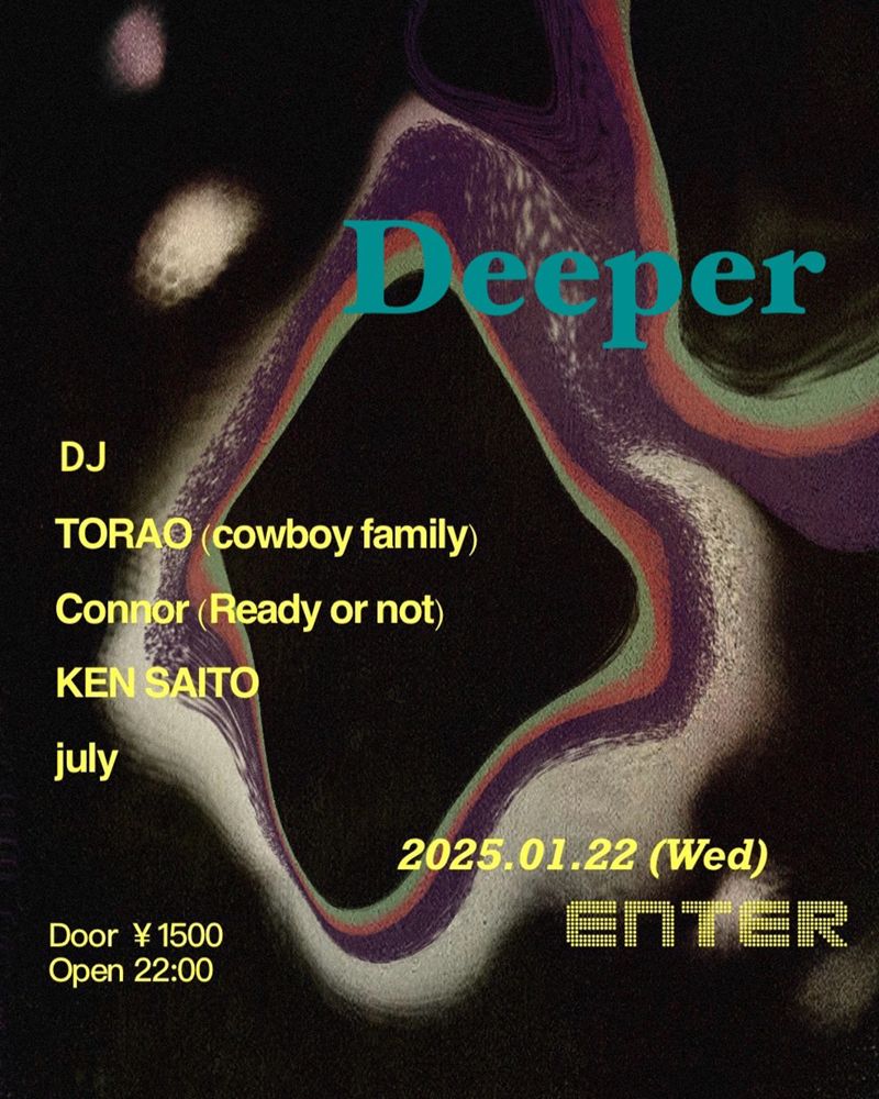 julyが主催するDeeper。第1回目にはCowboy FamilyのTORAO、Ready or notのConnor、KEN SAITOを招く。アシッドハウスを基調にミニマルなグルーヴの一夜。