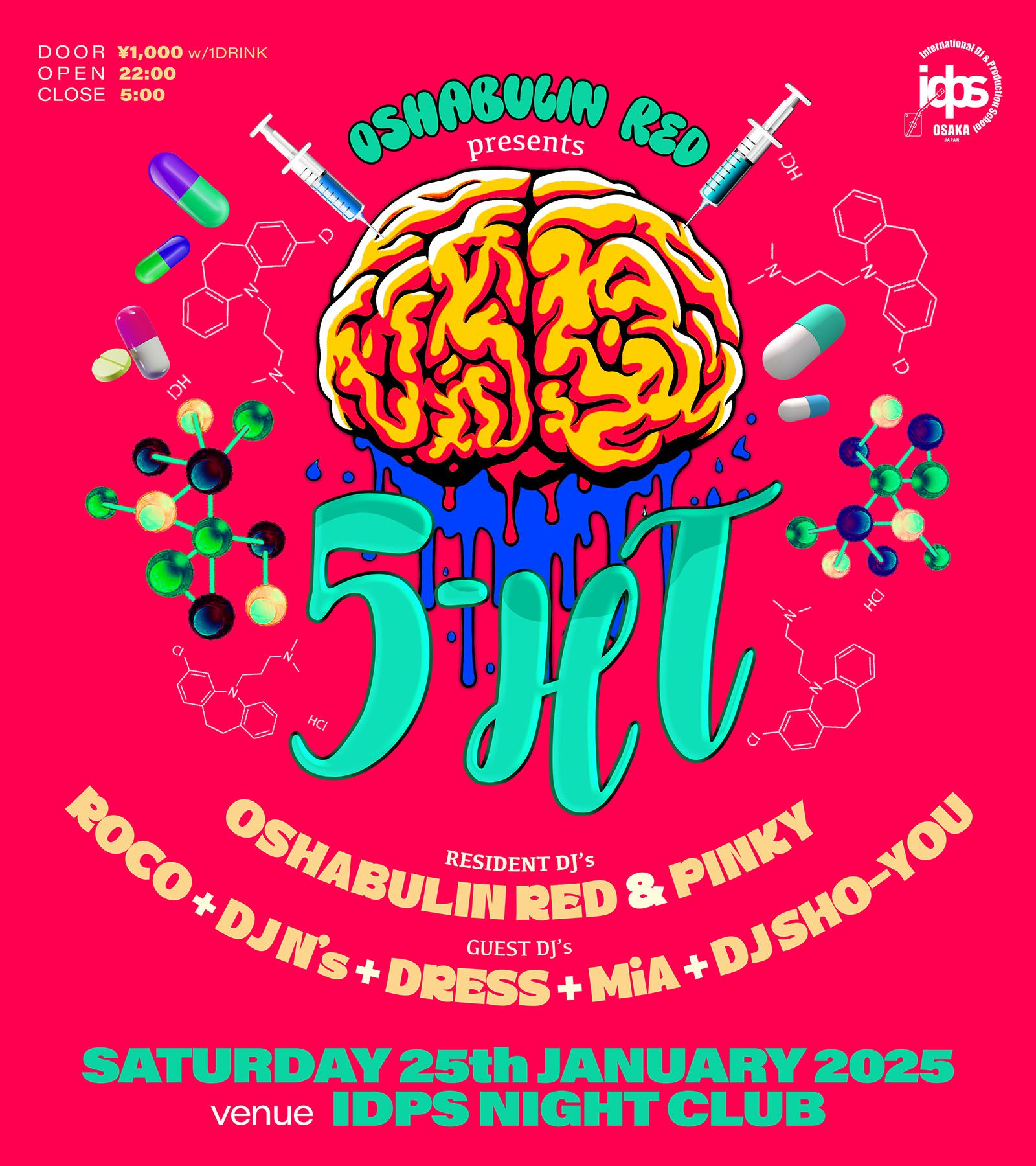 Psychedelic trance party 5-HT is presented by next generation DJ OSHABULIN RED, will start on Saturday 25 January at IDPS Night Club by IDPS OSAKA. OSHABULIN RED and PINKY will be the resident DJs and guests will include DJs from Kansai club scenes in pursuit of adrenaline-fuelled trance music!