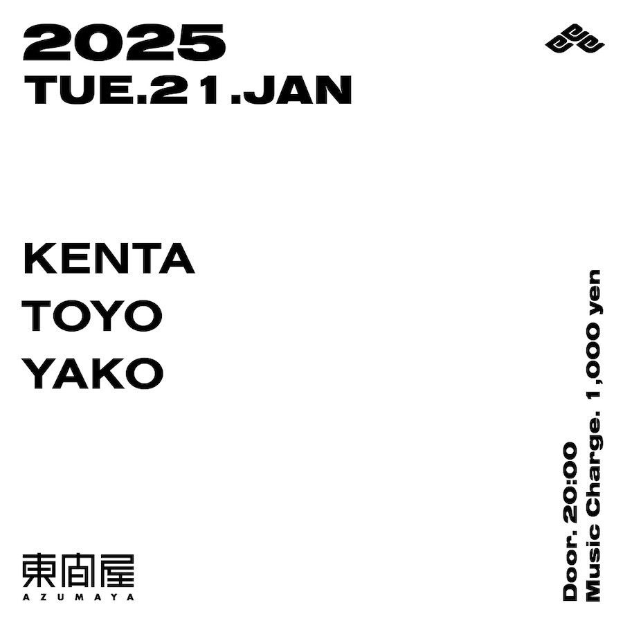 2025.01 21 JAN Azumaya -Tuesday- DISCO 0 Shares Facebook Twitter google Line DATE: 2025-01-21 TUE OPEN: 20:00 VENUE: PRICE: Music Charge 1,000yen LINE UP: KENTA TOYO YAKO