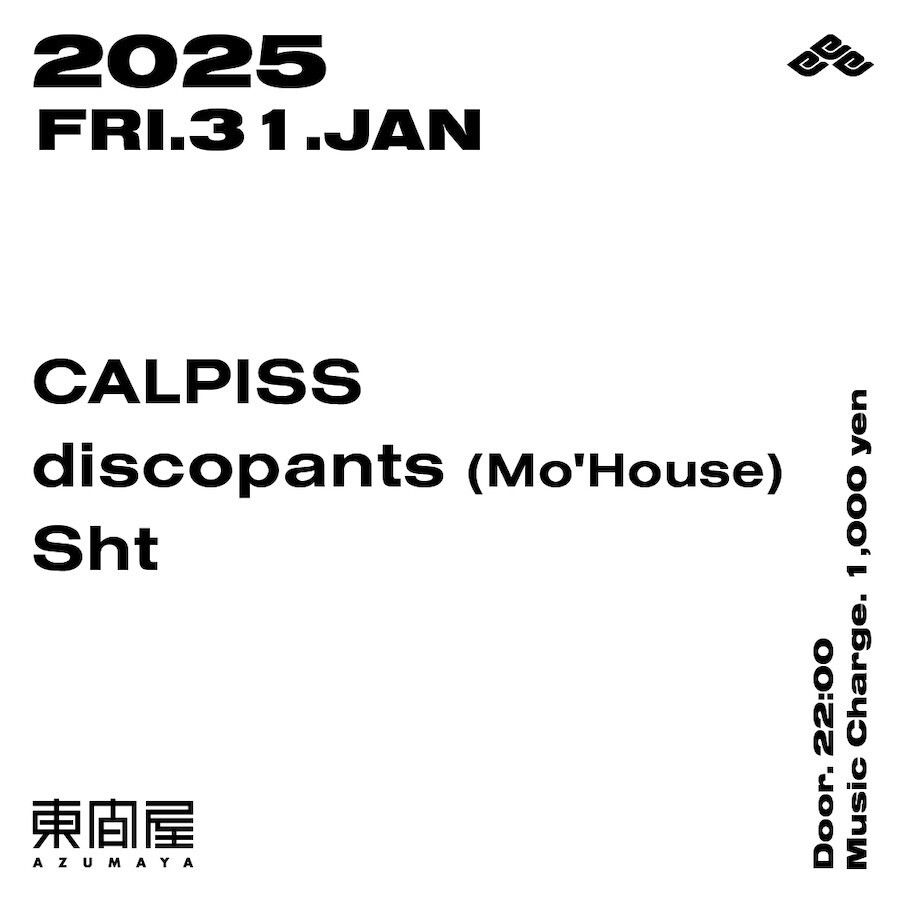 2025.01 31 JAN Azumaya -Friday- HOUSE 0 Shares Facebook Twitter google Line DATE: 2025-01-31 FRI OPEN: 22:00 VENUE: PRICE: Music Charge 1,000yen LINE UP: CALPISS discopants (Mo'House) Sht
