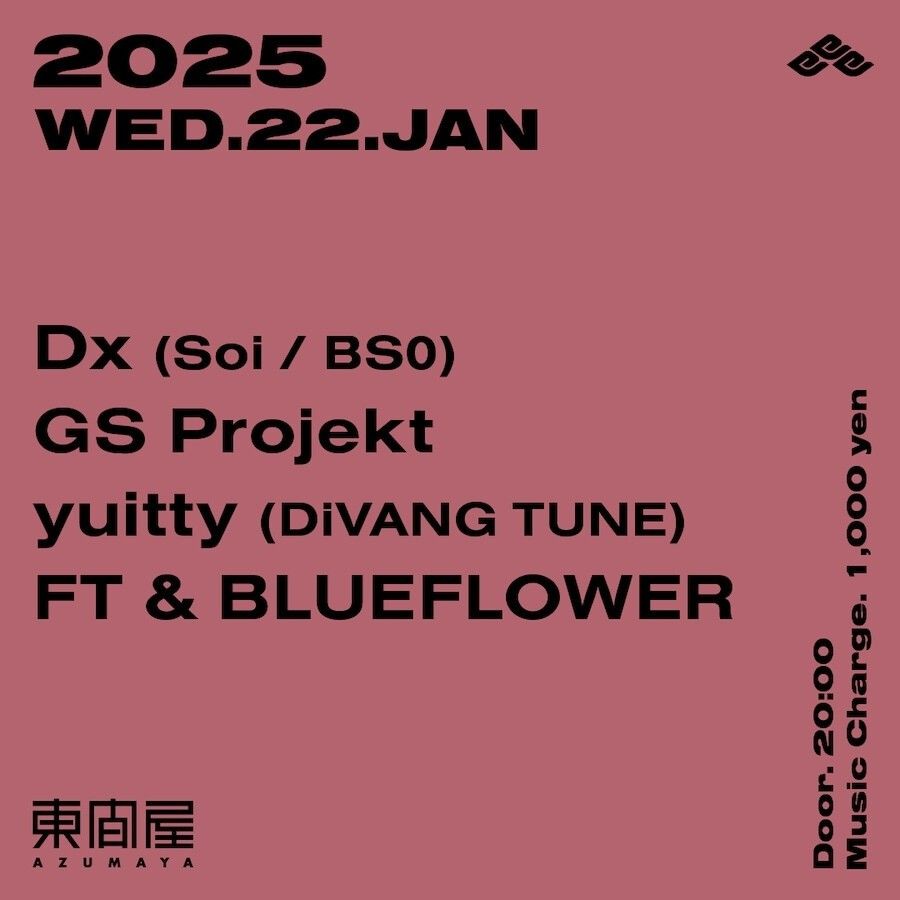 2025.01 22 JAN Azumaya -Wednesday- BASS MUSIC 0 Shares Facebook Twitter google Line DATE: 2025-01-22 WED OPEN: 20:00 VENUE: PRICE: Music Charge 1,000yen LINE UP: Dx (Soi / BS0) GS Projekt yuitty (DiVANG TUNE) FT & BLUEFLOWER
