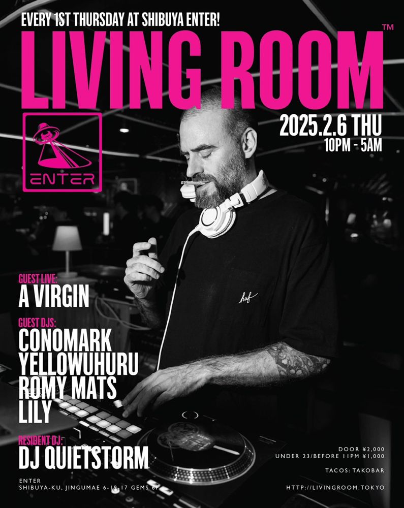 ヒップホップ/ハウス/ジャズに限らず、様々な手法で独自の音楽を提示し続けた真の音楽家であるDJ QUIETSTORM。彼だからこそ為し得ることのできる特別な一夜にはこれまで、平日のパーティにも関わらず様々なジャンルのトップDJ/アーティストだけでなく、これからの音楽を担う若いアーティストを招き、音楽を愛する多くの人々を魅了してきた。 代官山UNICE→渋谷contactを経て、渋谷ENTERではソファーに座ってのDJスタイルではないがダンスフロアー中央にブースが位置する新しいスタイルがLIVING ROOM™のコンセプトにマッチし毎回素敵な空間となっている。