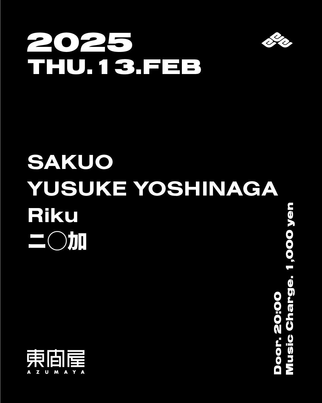 2025.02 13 FEB Azumaya -Thursday- ALLMIX 0 Shares Facebook Twitter google Line DATE: 2025-02-13 THU OPEN: 20:00 VENUE: PRICE: Music Charge 1,000yen LINE UP: SAKUO YUSUKE YOSHINAGA Riku ニ◯加