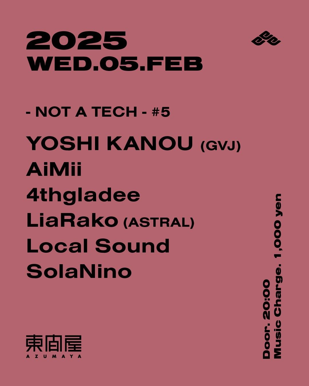 2025.02 05 FEB - NOT A TECH - #5 HOUSE TECHNO 0 Shares Facebook Twitter google Line DATE: 2025-02-05 WED OPEN: 20:00 VENUE: PRICE: Music Charge 1,000yen LINE UP: YOSHI KANOU (GVJ) AiMii 4thgladee LiaRako (ASTRAL) Local Sound SolaNino
