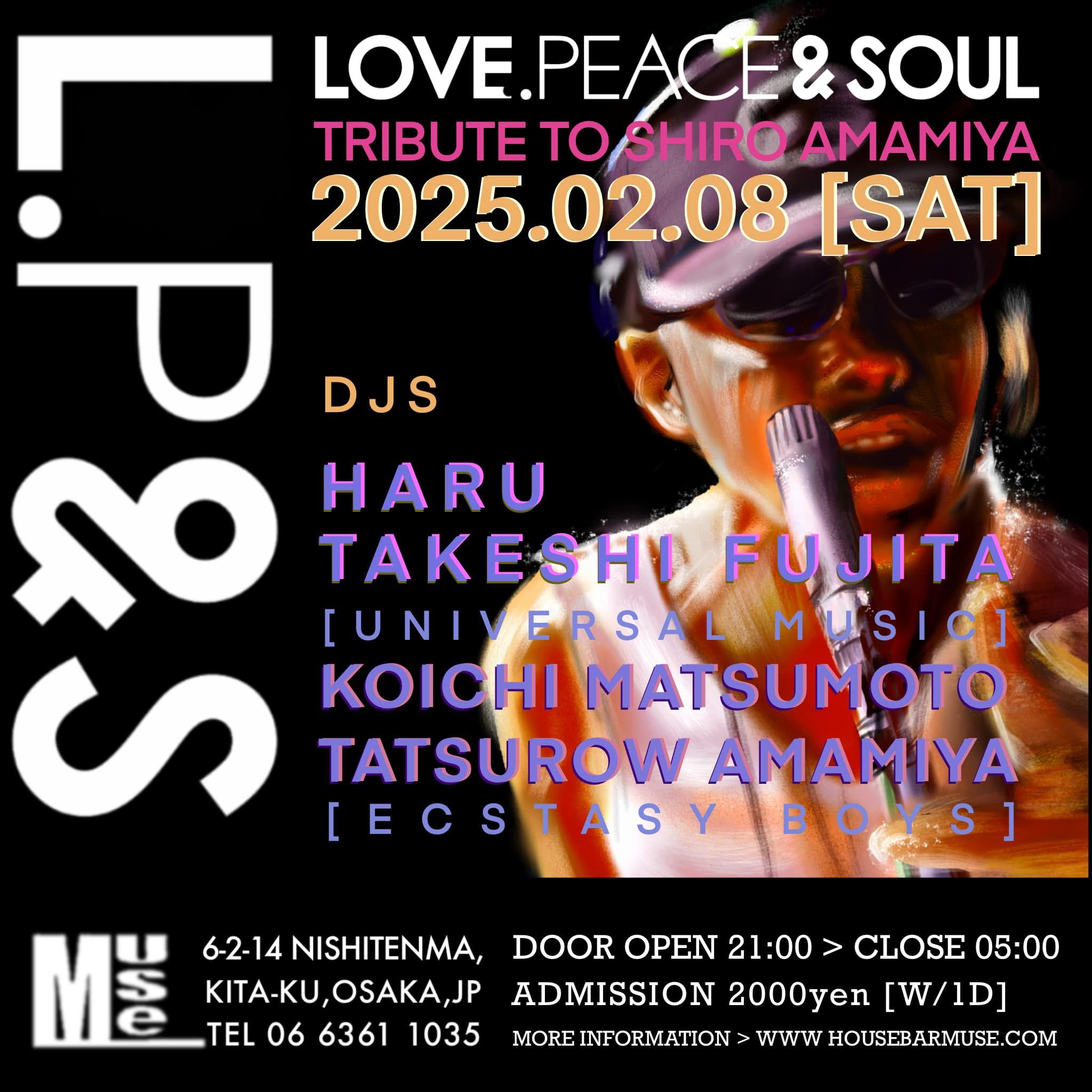 2025.02 08 FEB LOVE.PEACE & SOUL DEEP HOUSE HOUSE TECH HOUSE ELECTRONICA MINIMAL 0 Shares Facebook Twitter google Line DATE: 2025-02-08 SAT OPEN: 21:00 VENUE: PRICE: ¥2000/w1d LINE UP: HARU TAKESHI FUJITA [UNIVERSAL MUSICI KOICHI MATSUMOTO TATSUROW AMAMIYA [ECSTASY BONES ] house music
