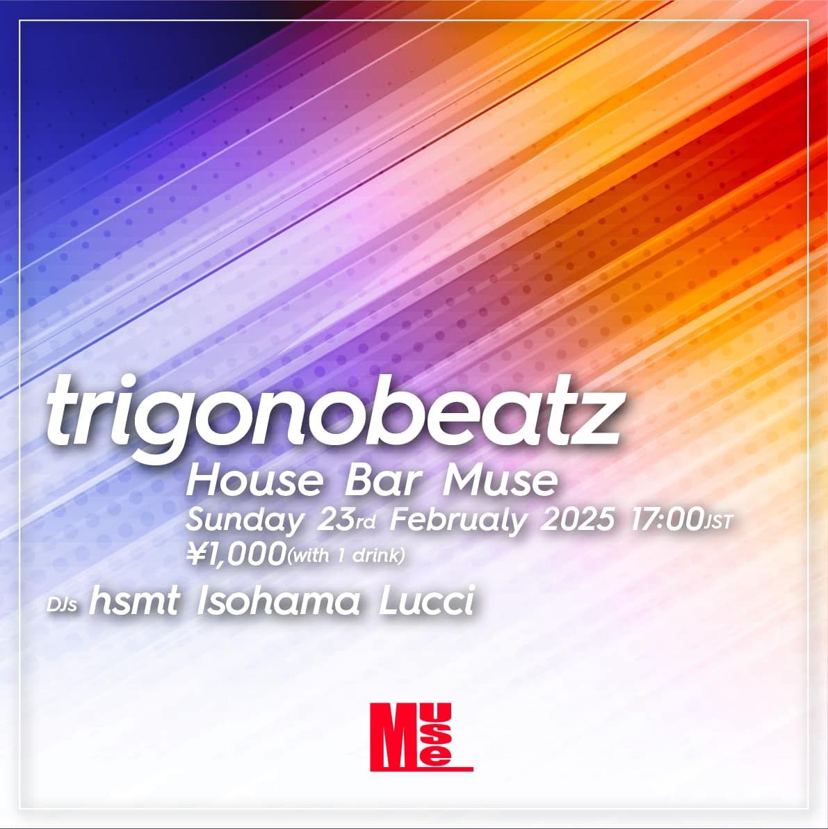 2025.02 23 FEB trigonobeatz DEEP HOUSE HOUSE TECH HOUSE 0 Shares Facebook Twitter google Line DATE: 2025-02-23 SUN OPEN: 17:00 VENUE: PRICE: ¥1000/w1d LINE UP: Dis hsmt Isohama Lucci Dis hsmt Isohama Lucci